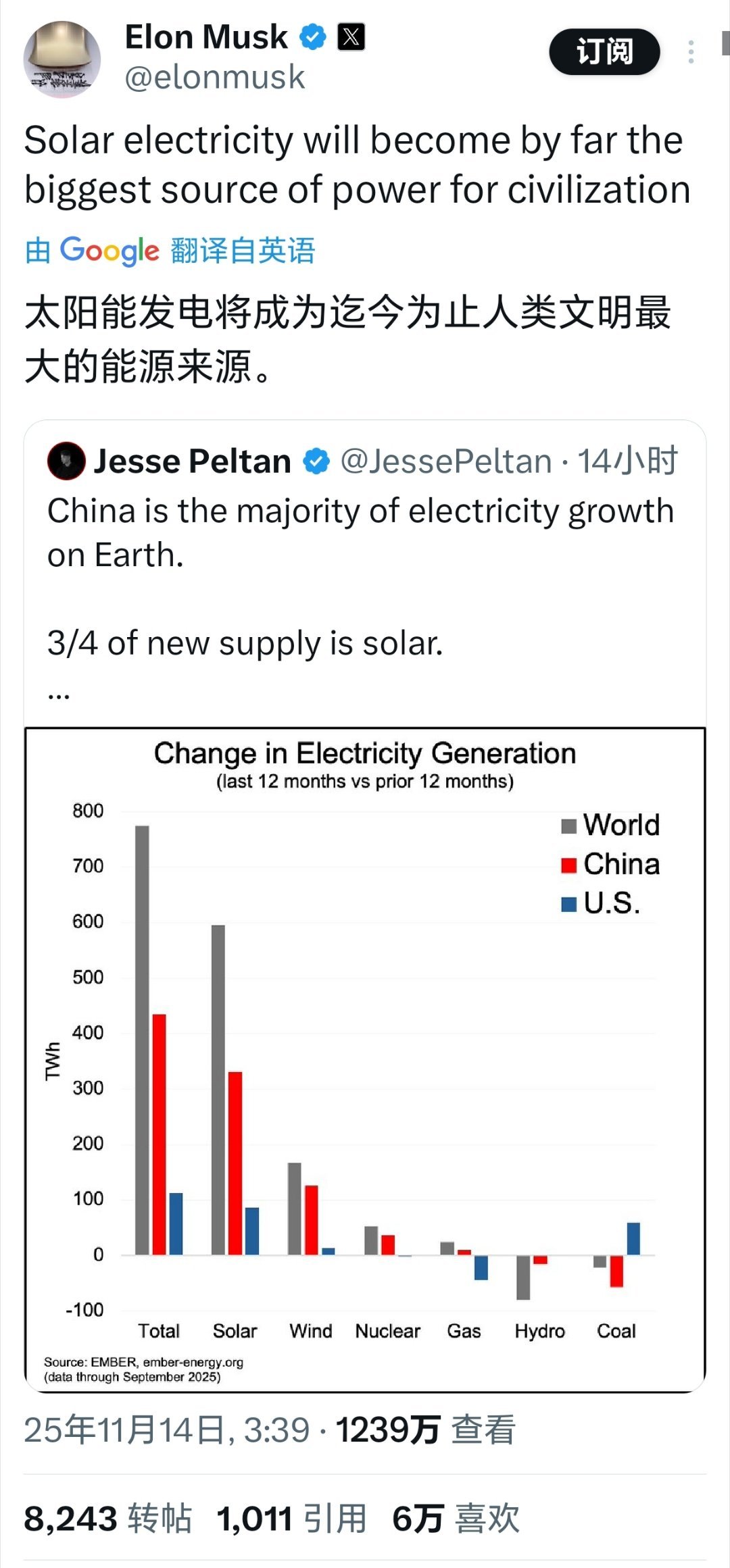 马斯克转发评论称,太阳能发电将成为迄今为止人类文明最大的能源来源。