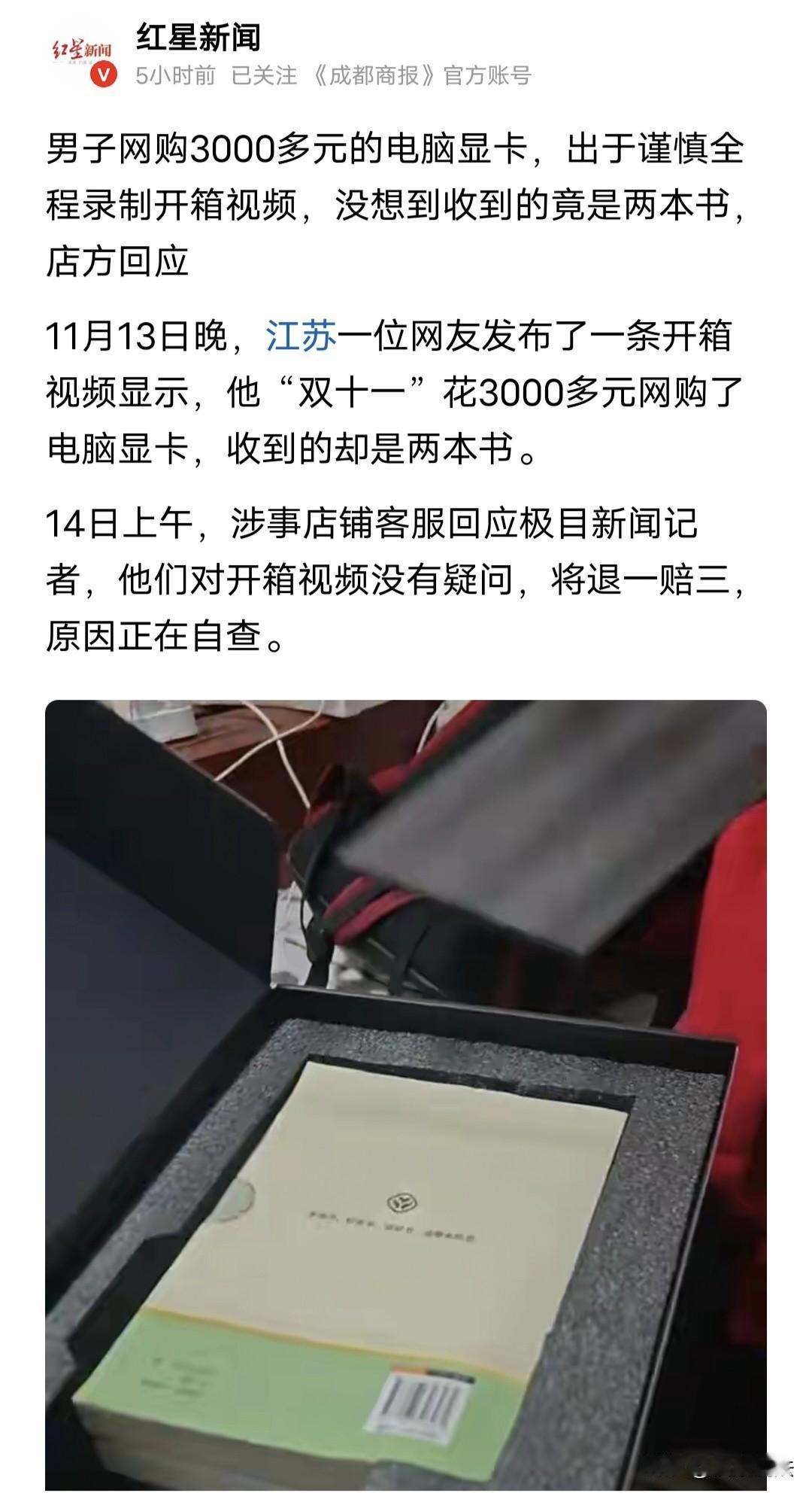 “邪门了?”江苏一男子花3293.83元网购的电脑显卡,到货后,出于谨慎录了开箱视频,打开一看竟是2本书,男子惊呆了,涉事店铺说:视频内容属实,不可能中途调包,随后,店铺客服给男子一个让他喜出望外的处理方案。 11月3号晚上,江苏一男子在网络上发了一条开箱视频,就像一颗投进平静湖面的石子,激起了千层涟漪,引起了网友们的好奇心。 原来,这名男子在“双11”期间想着能划算一些,就花了3293.83元在线上平台买了电脑显卡。 到货后,男子的朋友为了谨慎起见特意录了开箱视频。 开箱视频显示,外包装箱上面贴了塑料胶带,没有破损,基本上是完好的状态。 随后,打开外包装箱后,从里面拿出显卡的包装箱,上面是塑封的,也没有问题。 当从显卡的包装箱里掏出一个黑色的盒子,男子打开一看不禁“啊”了一声,只见盒子不是他心心念念的显卡,而是2本普普通通的书。 男子拿起书后都傻了,朋友在边上说他幸亏给你录个开箱视频吧。 男子发布的这段开箱视频时长2分多钟,可以看到包装盒外观没有什么异样,可是,里面为什么却不是显卡,而是2本书,那书是什么时候装进去的? 那显卡是什么时候被调包了?包装没拆开,又是哪个流程出了问题呢? 这段开箱视频一发出,短时间内获得6万次的点赞,而且,男子在视频中也公布了购买的店铺名称。 11月14号,记者联系了发布视频的男子,可遗憾的的没有得到回复。 不过,倒是联系上了涉事店铺的客服。 客服是这么说的,这个男子收到的货品确实是从他们店铺直接发出的。 11月13号晚上10点多,男子反馈收到2本书后,他们也查看了男子发的开箱视频,确认内容属实。 不过,对这件事,客服也特意说道,电脑显卡没有中途调包的可能,而且,货品的外包装、防拆贴,胶带都是店铺里的,这也都可以证明,显卡从发出到男子手中,包装环节没有出现问题。 那男子的显卡没有收到,收到的那两本书对于他也没有用,接下来该怎么办呢? 该店铺的客服态度还挺好,干脆直接的表示将对男子进行退一赔三的处理。 也就是说,店铺会退还男子购买显卡所花费的3293.83元,然后另外再赔付男子9881.49元。 客服说,他们会在14号上午优先给男子把退货退款流程走完。 之所以这么做,就是为了店铺的信誉,也是为了保护消费者应得的权益,因此一定会妥善处理。 那么,男子明明买的显卡,为什么会发错成两本书呢? 客服也很无奈,自己这边只是经销商不是制造商,也是第一次遇到这种事情。 从显卡包装盒的封贴来看也挺专业的,不过,我们店铺并没有这样的机器设备,所以也挺奇怪的。 对于这件事,客服说接下来,他们会去联系制造商,一起来调查这件事的真正原因。 不过,客服还透露一个细节,在13号晚上,客户已经报警,目前警方已经介入。 之后,男子在网上发了事情后续,商家给他退一赔三,现在9881.49元都已经到账了,退货退款也到了。 他说发这个视频,就是想引起大家注意,买贵重的物品一定要拍开箱视频,免得出事扯皮。 男子还说如果没有拍开箱视频,可能就是自己吃哑巴亏了。 而且,这件事发在网上后,商家一共花了大概12小时将这个事解决了,因为被网友关注,处理的速度相对较快。 有人猜测,这种就是两种情况,一个是前一个七天无理由退货掉包后给退回,但是商家没有查验,商家看塑料膜还在以为没拆就发别人了,就直接寄给下一个客户了,商家也不至于故意发两本书。 男子之所以短时间能得到退一赔三的解决方案,直接原因是他有开箱视频,而且视频较为完整。 所以,拍开箱视频要注意几点: 1、拍摄快递单号、收件人信息(可遮挡部分隐私),证明包裹来源。 2、展示快递员交付时的包裹外观(是否完好、有无挤压变形)。 3、拍摄外包装整体,展示胶带、防拆贴是否完整。 4、拍摄商品包装盒的塑封膜、防伪标签、封口贴(如显卡的塑封盒)。缓慢拆开商品包装,逐层展示内部物品(如盒子、配件、说明书)。 5、最后,不要丢弃任何包装材料,包括外箱、填充物、商品本身。 在这件事中,男子购买的是电脑显卡,但收到的却是两本书。这明显与男子的购买意愿不符,且商家无法给出合理的解释。 商家虽然声称显卡没有中途调包的可能,且包装环节没有问题,但无法解释为何会发出与商品不符的书籍。 在这种情况下,可以合理推测商家在发货过程中存在过失或故意欺诈的行为,导致男子收到了错误的商品。 根据《消费者权益保护法》第55条第1款规定:经营者提供商品或者服务有欺诈行为的,应当按照消费者的要求增加赔偿其受到的损失,增加赔偿的金额为消费者购买商品的价款或者接受服务的费用的三倍;增加赔偿的金额不足五百元的,为五百元。 因此,商家在确认男子收到的商品与购买不符后,态度较好,主动提出退一赔三的处理方案。 关注@福康说法 从日常点滴学法律,生活安稳更有底