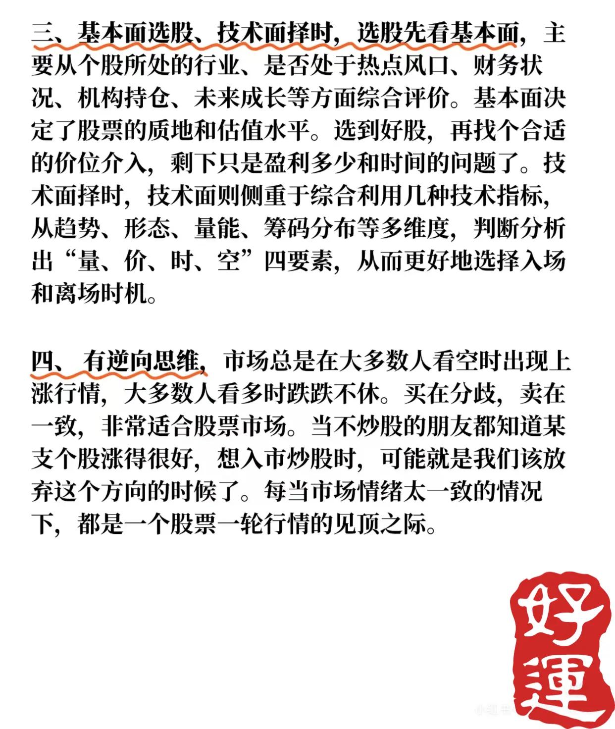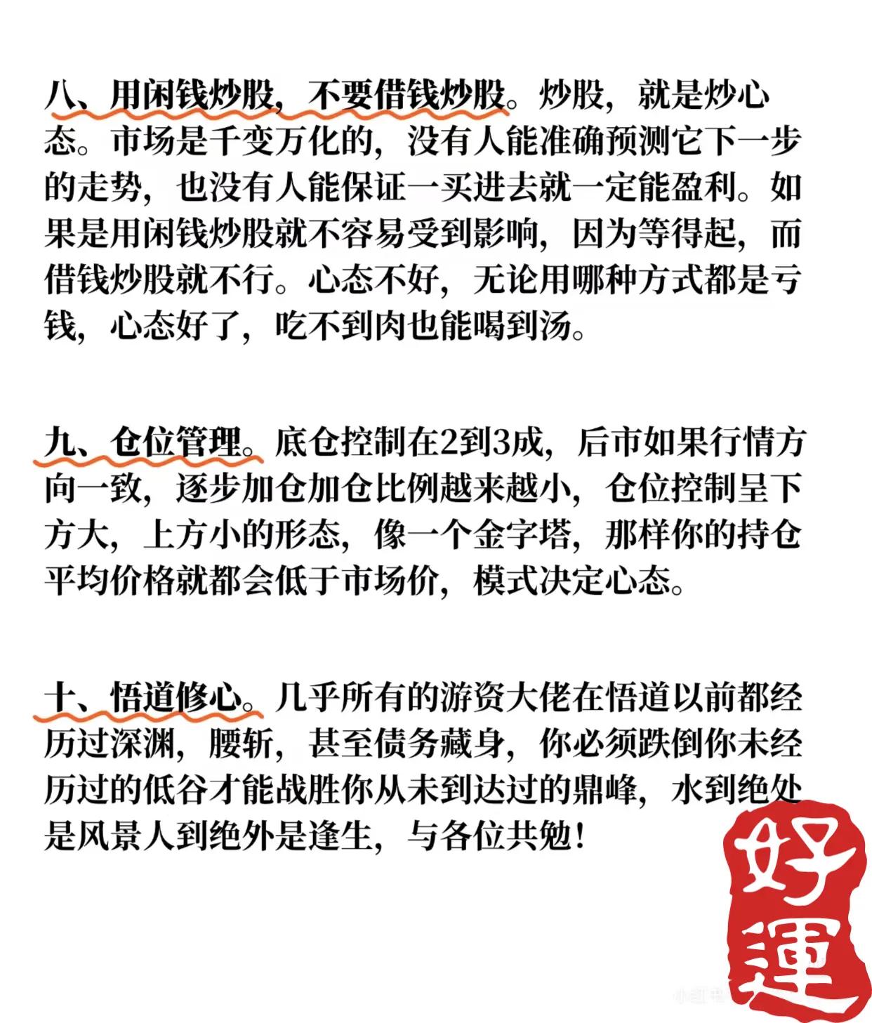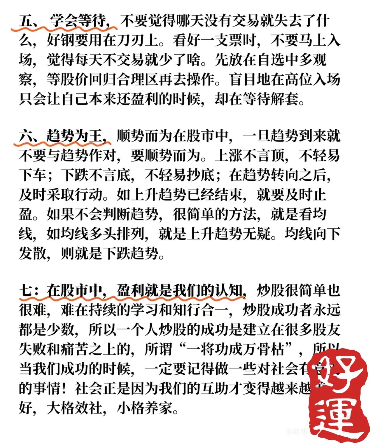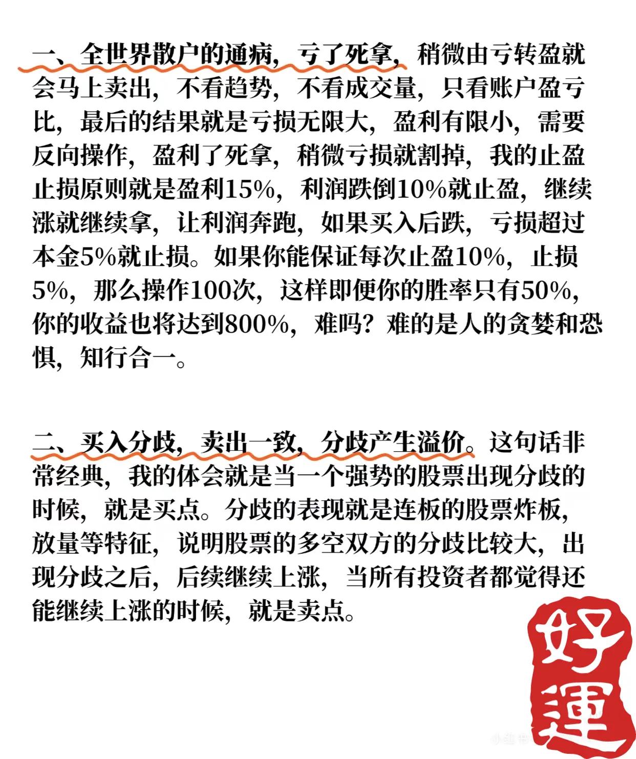 股票投资“铁律”,为您整理了一份系统化、易于理解的股票投资核心经验总结,涵盖从心态、策略到操作执行的全流程要点,助您提升投资认知与实战能力: 一、核心目标与信念 - “从30万炒到580万,全靠牢记这10条铁律”核心逻辑:投资成功并非依赖运气或短期投机,而是通过坚守科学方法论与正确心态,实现长期复利增长(案例展示资金量级的可行性,强调“铁律”的实践价值)。 二、散户常见误区与反向操作原则(纠偏认知) 1. 通病纠正: - 散户典型问题:亏了死扛(期待回本),稍有盈利就急于卖出(害怕回落),导致“亏损无限放大,盈利有限缩小”。 - 正确做法(反向操作):盈利时坚定持有(让利润奔跑),亏损时严格止损(控制风险)。 2. 具体止盈止损规则: - 止盈:盈利达15%后可分批兑现,但至少保证单次盈利10%;若继续上涨则持有。 - 止损:买入后亏损超本金5%必须果断离场(避免情绪干扰)。 - 数学验证:若每次止盈10%、止损5%,胜率仅需50%,长期操作100次的理论收益可达800%(关键在“知行合一”克服贪婪与恐惧)。 三、买卖时机与市场情绪(把握关键节点) 1. 分歧与一致的辩证关系: - 买入分歧:强势股出现“炸板”“放量”等分歧信号(多空博弈激烈)时,往往是买点(后续可能继续上涨)。 - 卖出一致:当所有投资者都认为“还能涨”(市场情绪高度一致,如非股民都想入市),此时是卖点(行情大概率见顶)。 - 总结:“买在分歧,卖在一致”是市场永恒规律。 四、选股与择时的科学方法(底层逻辑) 1. 基本面选股+技术面择时: - 选股:优先关注行业前景(是否热点/风口)、公司财务状况(健康度)、机构持仓(资金认可度)、未来成长性(业绩潜力),综合评估股票质地与合理估值。 - 择时:通过技术指标(如趋势、形态、量能、筹码分布等)判断“量、价、时、空”四要素,精准定位买卖时机(好股也需好价格)。 2. 逆向思维: - 市场规律:多数人看空时易上涨,多数人看多时易下跌(情绪极端化预示反转)。 - 实操信号:当非股民都知道某股票大涨并想入场时,可能是卖出时机;市场情绪过于一致(全民热议)往往是行情顶部。 五、操作纪律与心态管理(执行保障) 1. 学会等待: - 避免频繁交易,选中标的后先放入自选池观察,等待股价回归合理区间再出手(盲目追高易被套牢,耐心等待关键买点)。 2. 趋势为王: - 顺势而为是核心原则——上涨趋势中不轻易下车(不猜顶),下跌趋势中不盲目抄底(不猜底)。 - 趋势判断工具:通过均线系统辅助(如均线多头排列=上升趋势,均线空头排列=下跌趋势),趋势转向后及时调整操作(止盈或止损)。 3. 盈利本质: - 投资收益最终源于个人认知(认知范围内的机会才能把握),成功者永远是少数(需持续学习并做到知行合一);成功后应感恩回馈社会(“一将功成万骨枯”的敬畏之心)。 六、风险控制与长期生存(底线思维) 1. 用闲钱炒股: - 禁止借钱炒股!市场无法预测,闲钱投资心态更稳(能承受波动),借钱则易因压力导致非理性操作(心态崩盘必然亏损)。 2. 仓位管理(金字塔结构): - 底仓控制在2-3成(降低初始风险),若行情符合预期再逐步加仓,但加仓比例逐次减少(形成“下方大、上方小”的金字塔结构),最终平均持仓成本低于市场价,心态更从容。 3. 悟道修心: - 游资大佬的成功均经历过重大挫折(如腰斩、债务危机),低谷是通往巅峰的必经之路;保持长期韧性,在困境中坚持终会迎来转机(“水到绝处是风景,人到绝境是逢生”)。 总结:10条铁律的核心框架 1. 目标驱动:通过科学方法实现资金复利增长(案例激励)。 2. 认知纠偏:反向操作止盈止损,破解散户本能误区。 3. 时机把握:分歧买、一致卖,紧跟市场情绪拐点。 4. 底层逻辑:基本面筛选优质股,技术面定位买卖点,逆向思维预判反转。 5. 执行纪律:等待合理价格,顺势而为,用认知变现。 6. 风险底线:闲钱投资+金字塔仓位+修心韧性,确保长期生存。 这些铁律不仅是具体操作技巧,更是涵盖心态、认知、风控的完整投资哲学。若能真正理解并严格执行,将大幅提升投资成功率。
