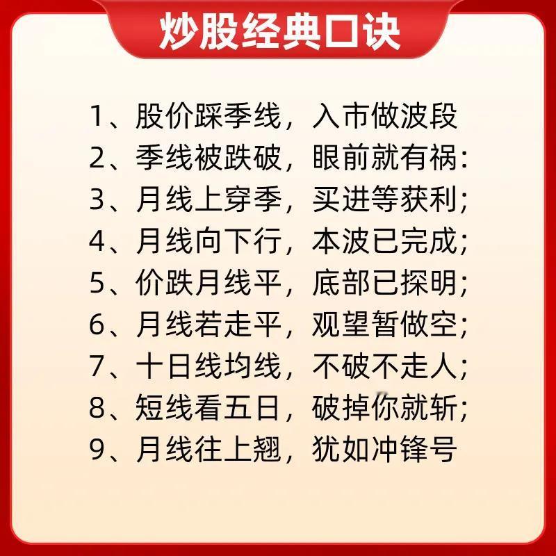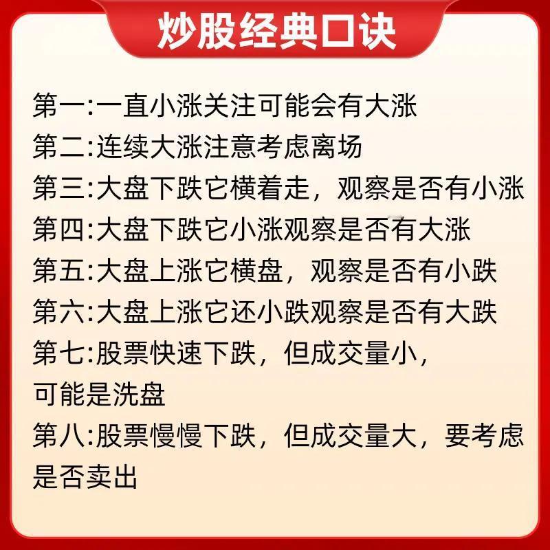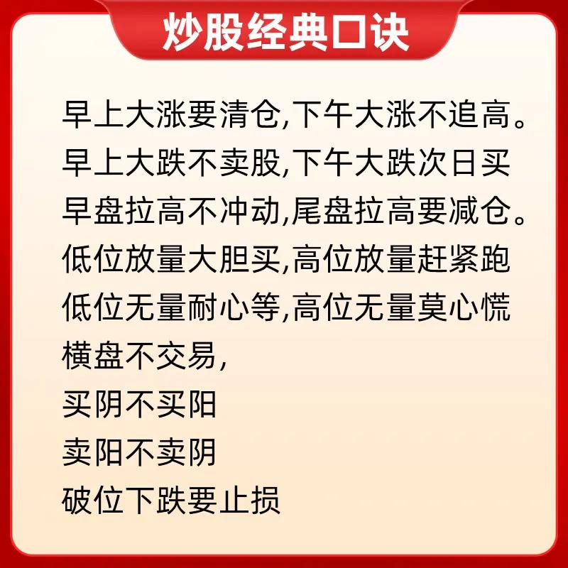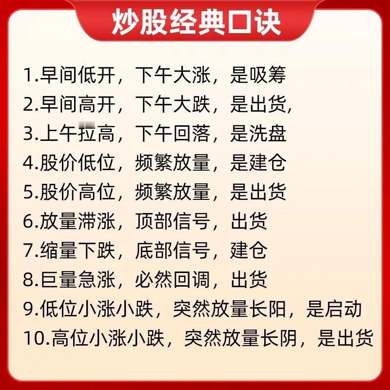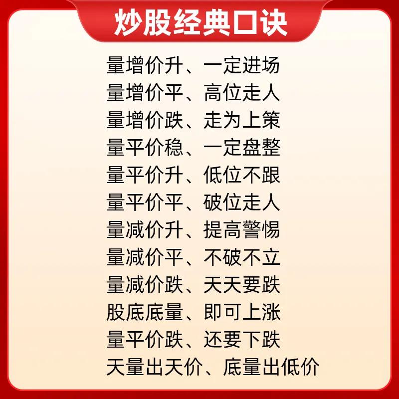 炒股经典口诀,核心内容涵盖: 1. 分时段操作策略:如早盘大跌可加仓、大涨宜减仓;下午大涨考虑减仓或次日买入;早盘拉高不追、尾盘拉高减仓等,强调根据不同时间段股价表现灵活应对。 2. 量价关系指导:如“量增价升进场、量增价平/跌走人”“量平价升低位不跟”“天量出天价、底量出低价”等,明确成交量与价格变化的对应操作信号。 3. 特殊市场形态判断:包括低位小涨后放量长阳为启动信号、高位放量长阴为出货信号;大盘涨跌时个股横盘/小涨小跌的观察要点(如大盘跌它横着走可能有小涨);急跌无量可能是洗盘、慢跌放量需考虑卖出等。 4. 关键均线参考:如股价踩季线可做波段、月线上穿季线为买入信号、月线走平观望、十日线不破持有、五日线破位需斩仓等,提供均线相关的操作依据。 5. 通用操作原则:如“买阴不买阳、卖阳不卖阴”“破位下跌要止损”“横盘不交易”“低位无量耐心等、高位无量莫心慌”等,强调交易纪律与心态控制。 整体以口诀形式归纳了股市中分时策略、量价信号、特殊形态识别、均线应用及基础操作纪律,旨在帮助股民快速掌握实用参考技巧。