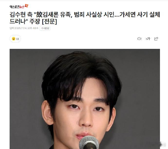 14日多家韩媒发文称,金秀贤方律师:“李某(金赛纶姨妈)与已故金赛纶遗属,事实上已承认犯罪……主张金世义的欺诈造谣事实浮出水面” 。