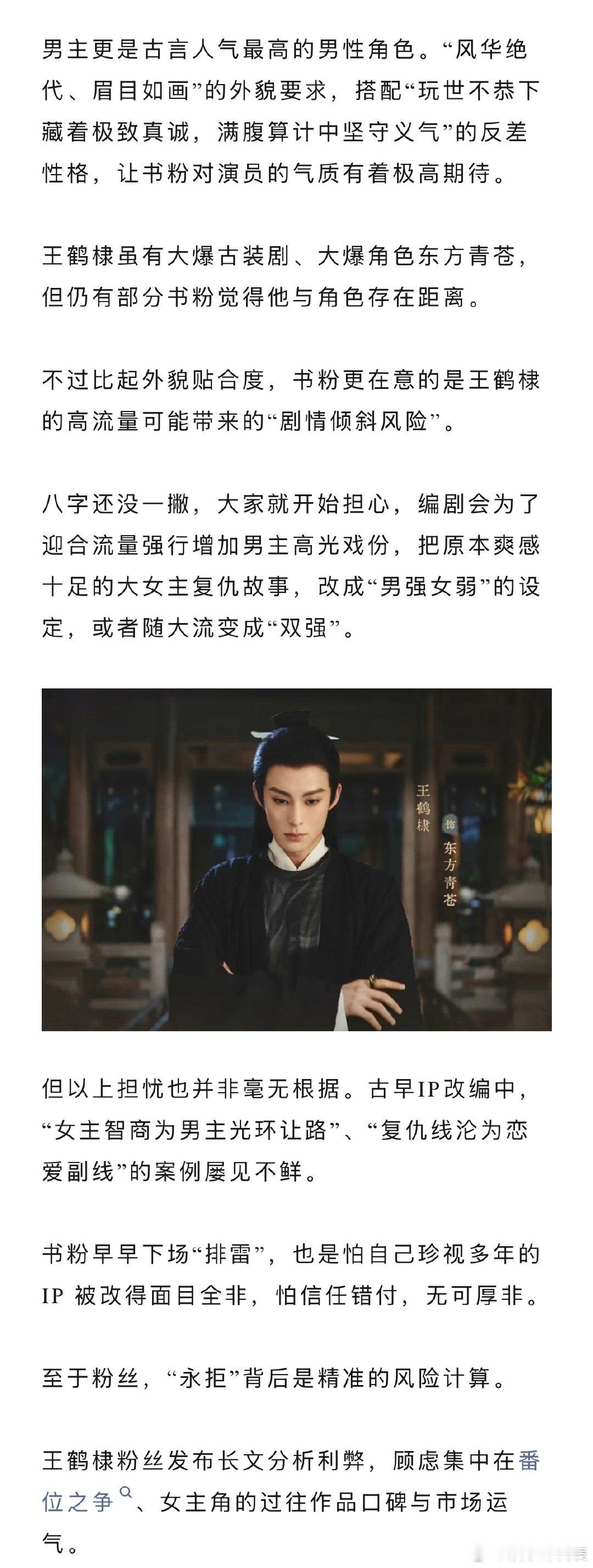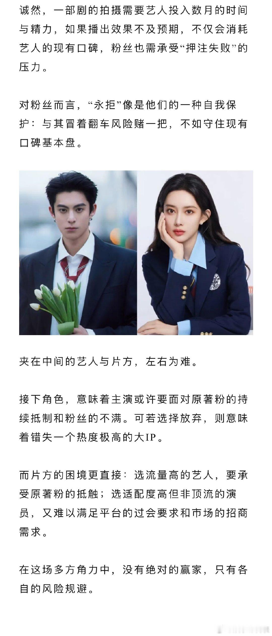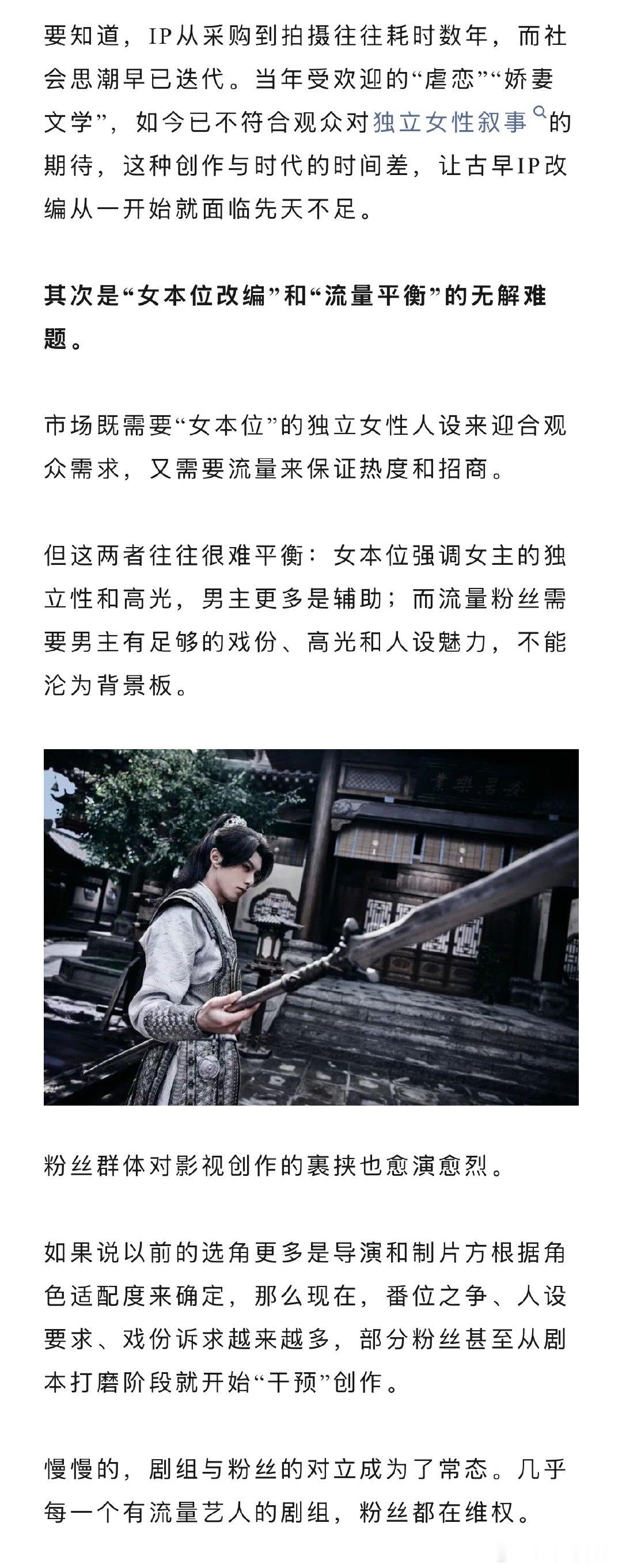 片方的困境更直接,选择流量高的艺人,要承受原著粉的抵触;选适配度高但非顶流的演员,又难以满足平台的过会要求和市场的招商要求。在这场多方角力中,没有绝对的赢家,只有各自的风险规避。