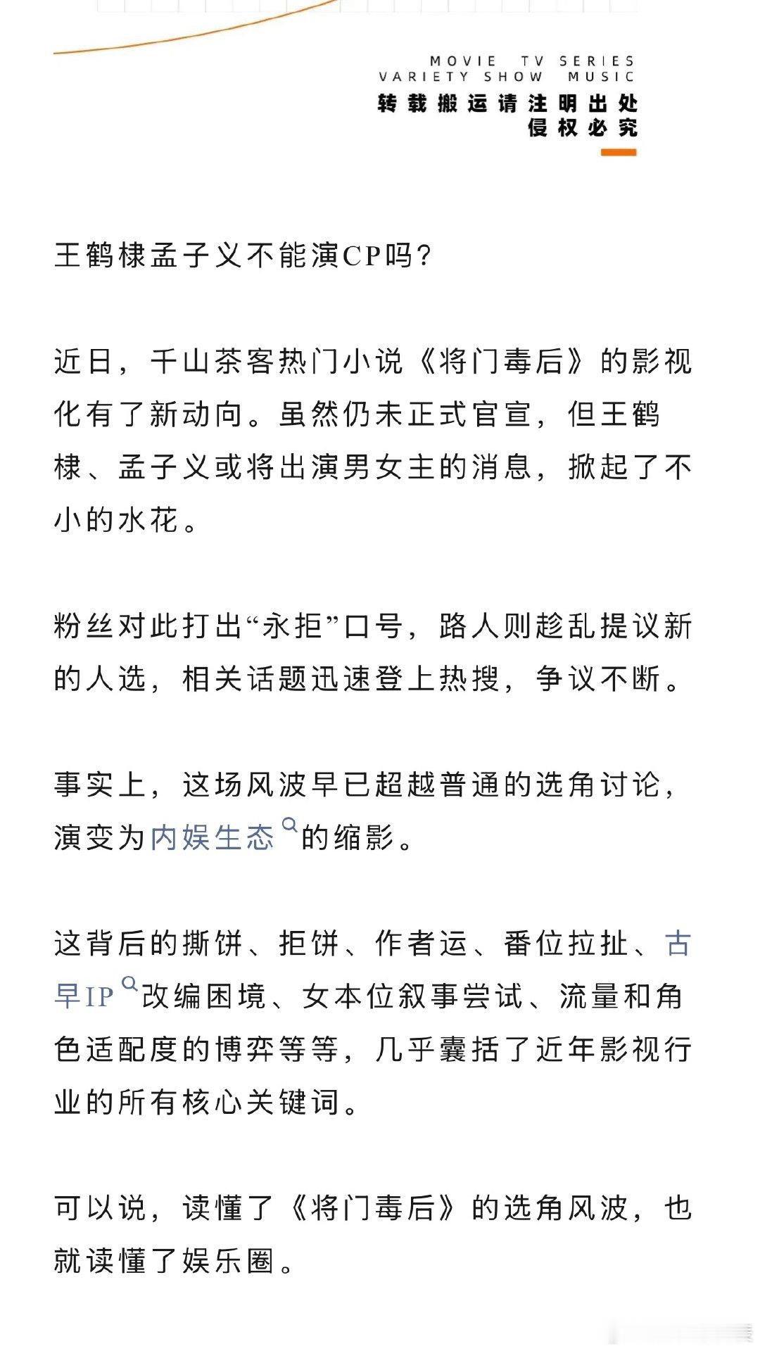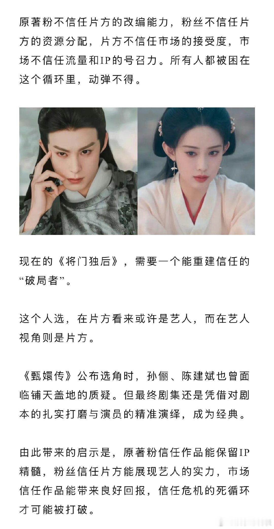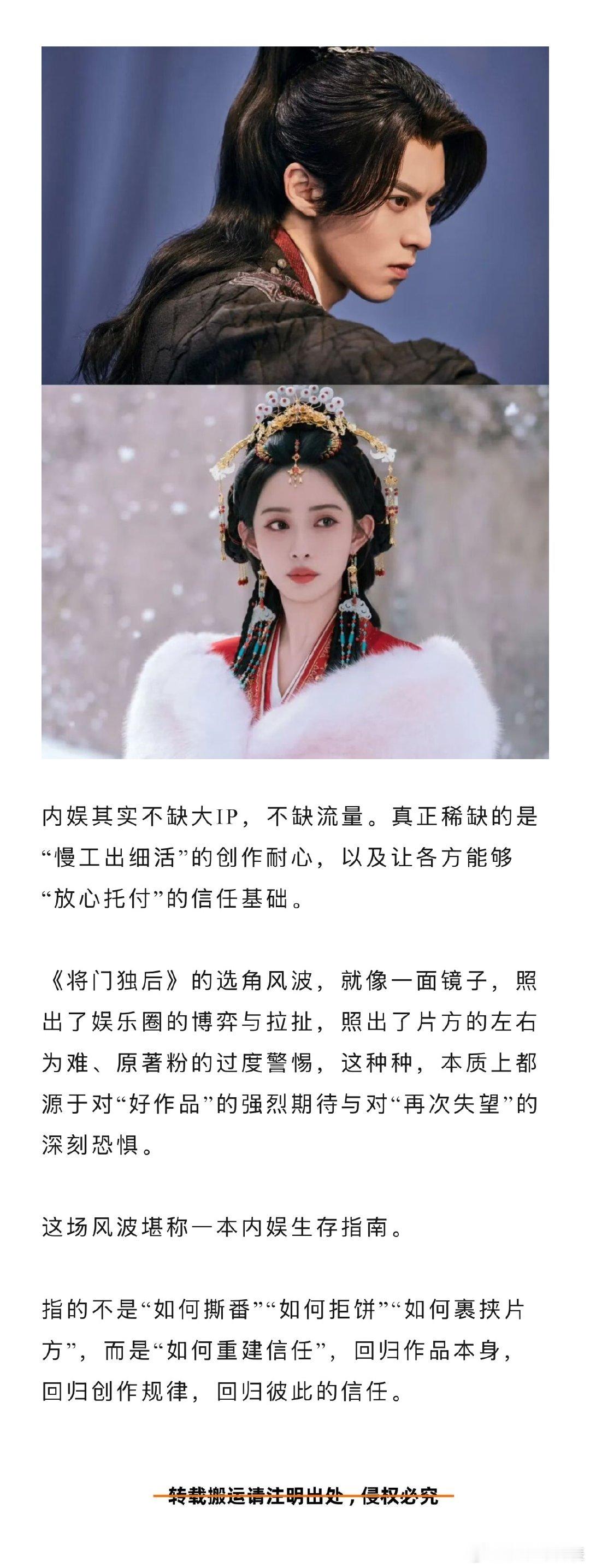 片方的困境更直接,选择流量高的艺人,要承受原著粉的抵触;选适配度高但非顶流的演员,又难以满足平台的过会要求和市场的招商要求。在这场多方角力中,没有绝对的赢家,只有各自的风险规避。