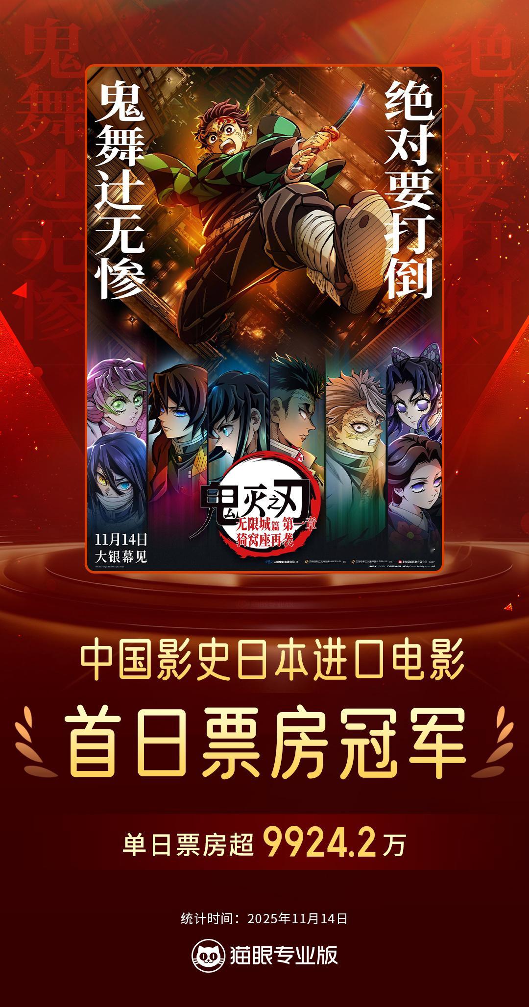 据猫眼专业版数据,电影《鬼灭之刃:无限城篇 第一章 猗窝座再袭》首映日票房超9924.2万,刷新中国影史日本进口电影首映日票房纪录!