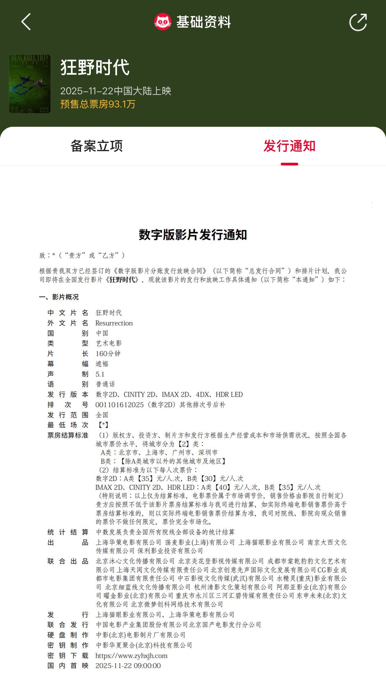 据猫眼专业版数据,易烊千玺、舒淇领衔主演电影《狂野时代》发行通知已出,片长160分钟,影片将于11月22日全国上映!