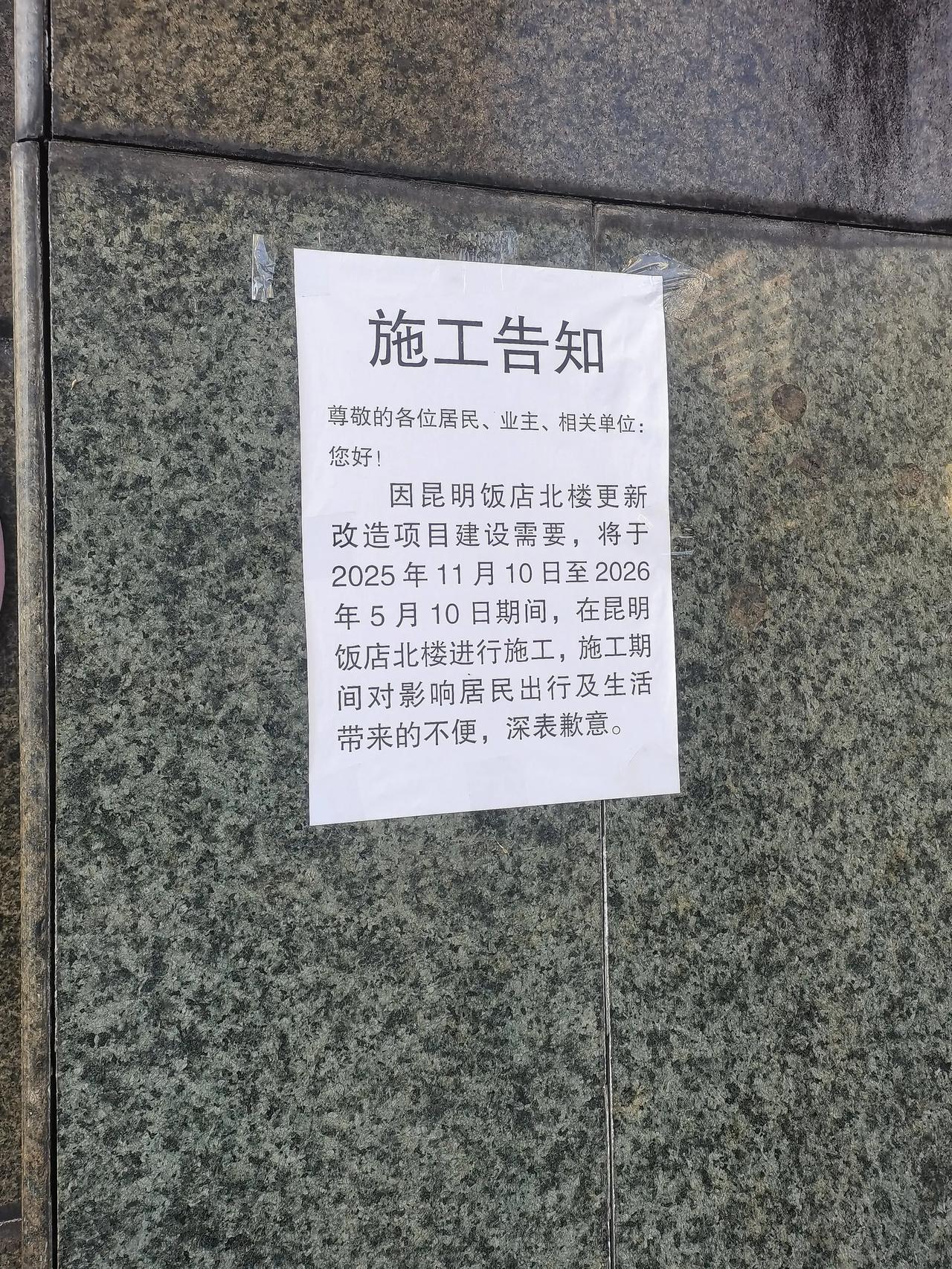 昆明饭店位于昆明市东风路与白塔路交叉口,酒店名由1961年入住酒店的郭沫若先生所题 酒店包括了主楼,副楼,及4000余平的花园草坪,也是昆明市中心最大草坪花园的酒店了吧! 酒店建于1958年,至今快有70年的历史了。 近期开始对主楼进行升级改造了,这也算是顺应市场,旁边有君悦,香格里拉,及洲际旗下的假日,地段是好,竞争也大,别的都是新的高端的,重新装修升级过的,这几年生意应该不太好了,4年前住过里面,感觉入住率并不高。 可惜了云南饭店,一个东面,一个西面。可云南饭店只有其名字没有实际的饭店实体。昆明饭店也算是有一定的历史了,希望开成昆明的,云南的百年饭店,像绍兴的咸享一样,打造其品牌价值。以上仅供参考,属个人意见!