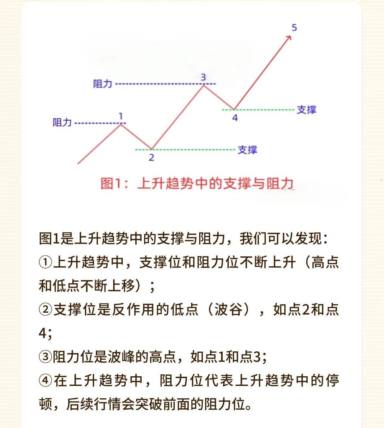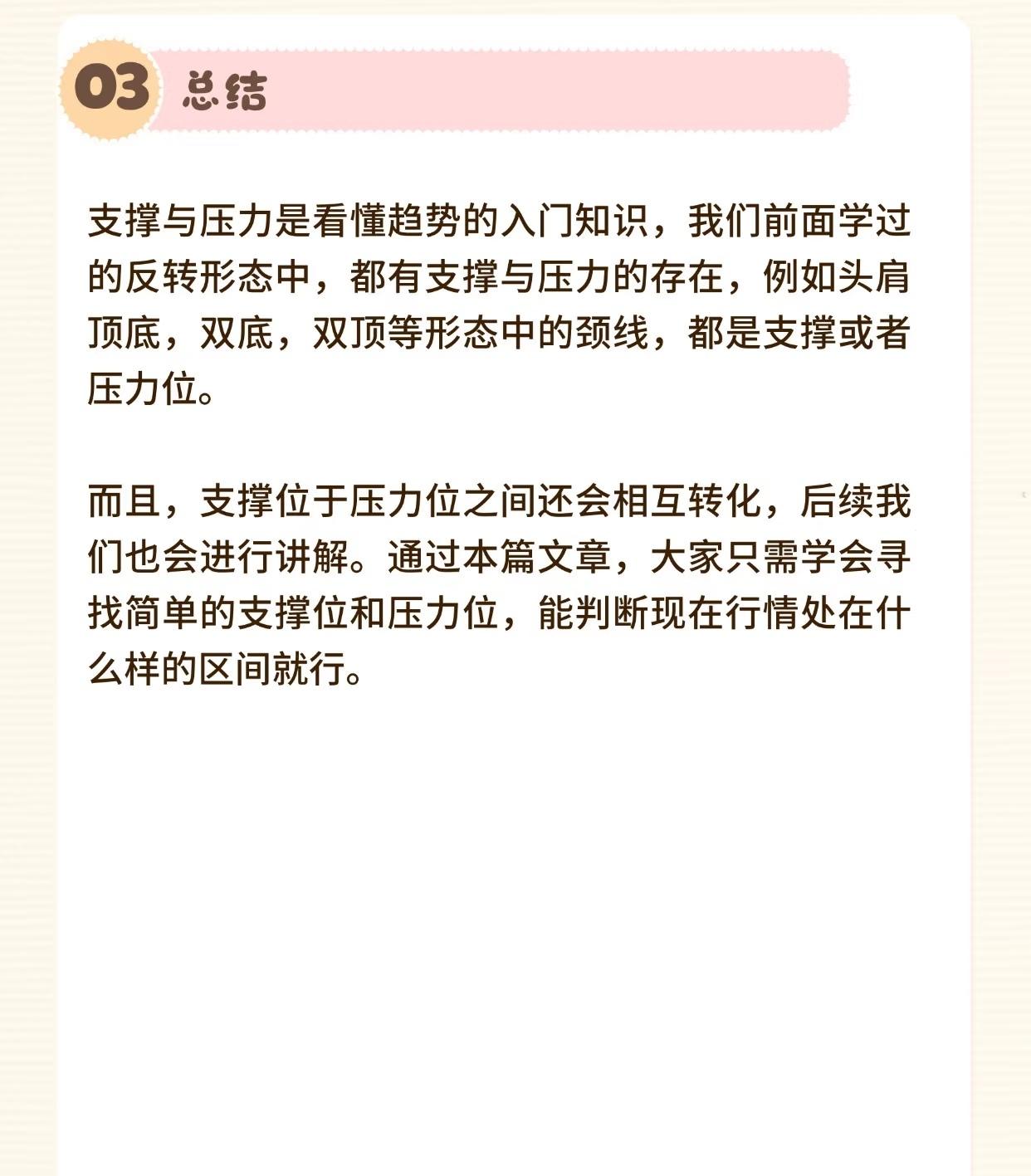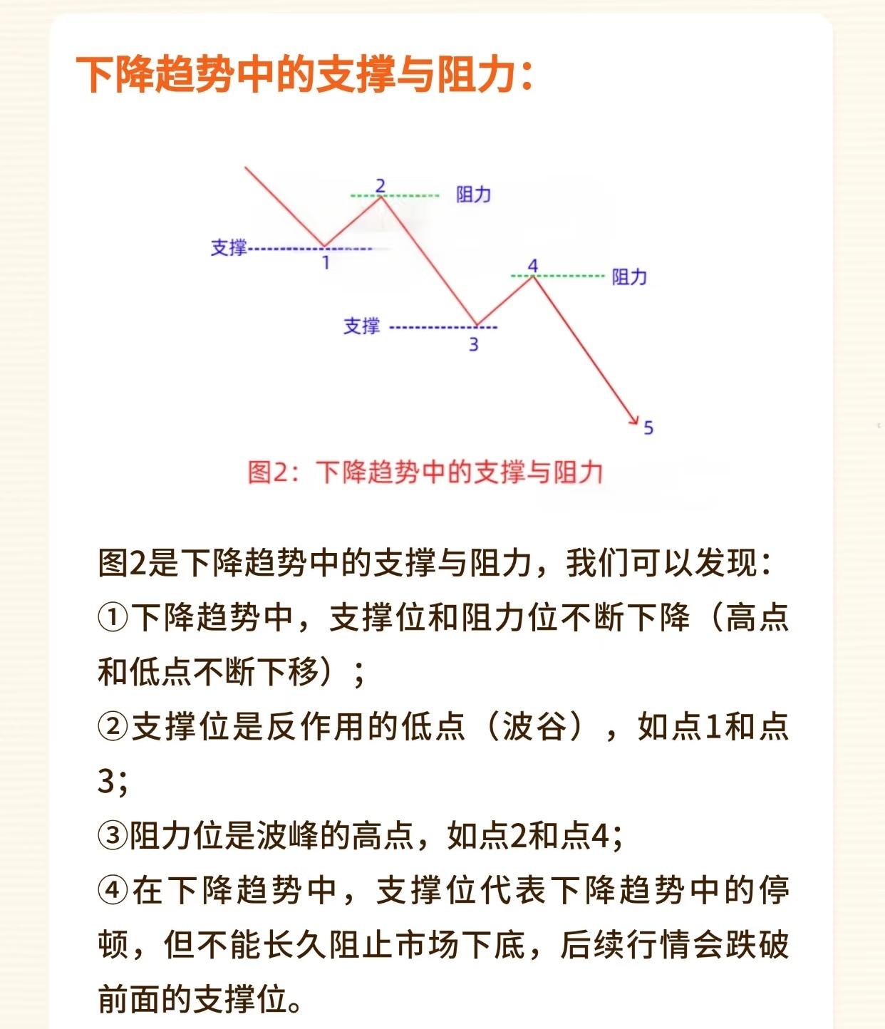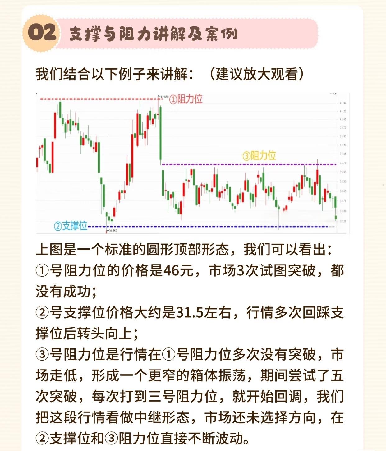 股票技术分析中“支撑与阻力”的基础概念、应用特点及实际案例,是一套循序渐进的技术分析入门教学内容,主要内容可总结如下: 1. 支撑与阻力的基本概念(第1张图) - 支撑:指股价下跌过程中遇到买盘强劲而止跌回升的价位或区域,通常是波谷(最低点),代表下方买盘力量较强,股价触及后容易反弹。 - 阻力:指股价上涨过程中遭遇卖盘压力而回落的价位或区域,通常是波峰(最高点),代表上方卖盘力量较强,股价触及后容易回落。 2. 上升趋势中的支撑与阻力(第1、2张图) - 在上升趋势中,股价整体向上,支撑位和阻力位都不断抬高(即低点和高点逐步上移)。 - 支撑位出现在波谷(如点2和点4),是股价回调时的止跌位置; - 阻力位出现在波峰(如点1和点3),是股价上涨过程中的暂时停顿点,但通常会被突破,推动趋势继续上行。 - 上升趋势中,旧的阻力位一旦被突破,往往会转化为新的支撑位。 3. 下降趋势中的支撑与阻力(第3张图) - 在下降趋势中,股价整体向下,支撑位和阻力位都不断降低(即低点和高点逐步下移)。 - 支撑位出现在波谷(如点1和点3),是股价反弹的暂时停顿位置,但往往难以持久,最终会被跌破; - 阻力位出现在波峰(如点2和点4),是股价下行中的压力区域。 - 下降趋势中,支撑位更多表现为短期停顿,而非趋势反转点。 4. 支撑与阻力的实际案例分析(第4张图) - 通过一个具体的股票K线图案例,展示了支撑位与阻力位在实际走势中的表现: - 阻力位(如46元):股价多次尝试突破但未成功,显示上方抛压较重; - 支撑位(如31.5元):股价多次回踩后反弹,说明下方买盘支撑较强; - 震荡区间(如多次未能突破的阻力位形成箱体):股价在一定范围内反复波动,多空双方力量相对均衡,市场尚未选择明确方向,属于中继形态。 - 该案例也体现了圆形顶部等反转形态中支撑与阻力的典型特征,市场在此类形态中往往处于犹豫和平衡状态。 5. 支撑与阻力的总结与应用(第5张图) - 支撑与阻力是理解市场趋势和价格行为的基础知识,也是分析反转形态(如头肩顶/底、双顶/底等)的重要工具,其中颈线常常扮演支撑或阻力的角色。 - 支撑与阻力并非固定不变,它们在特定条件下可以相互转化(比如突破后的阻力位可能成为新支撑,跌破后的支撑位可能转为新阻力)。 - 学习目标是能够识别简单的支撑位和阻力位,并判断当前行情处于何种价格区间,为后续更深入的技术分析打下基础。 整体来看,这套内容从理论定义入手,到趋势中的表现,再到实际K线图案例分析,最后进行归纳总结,系统地介绍了支撑与阻力在股票技术分析中的应用,适合初学者掌握价格行为分析的基础逻辑。