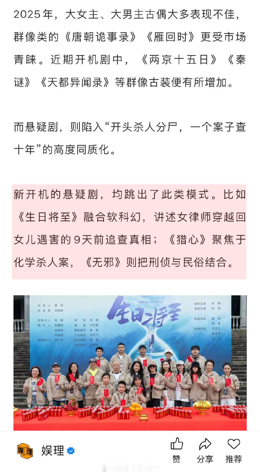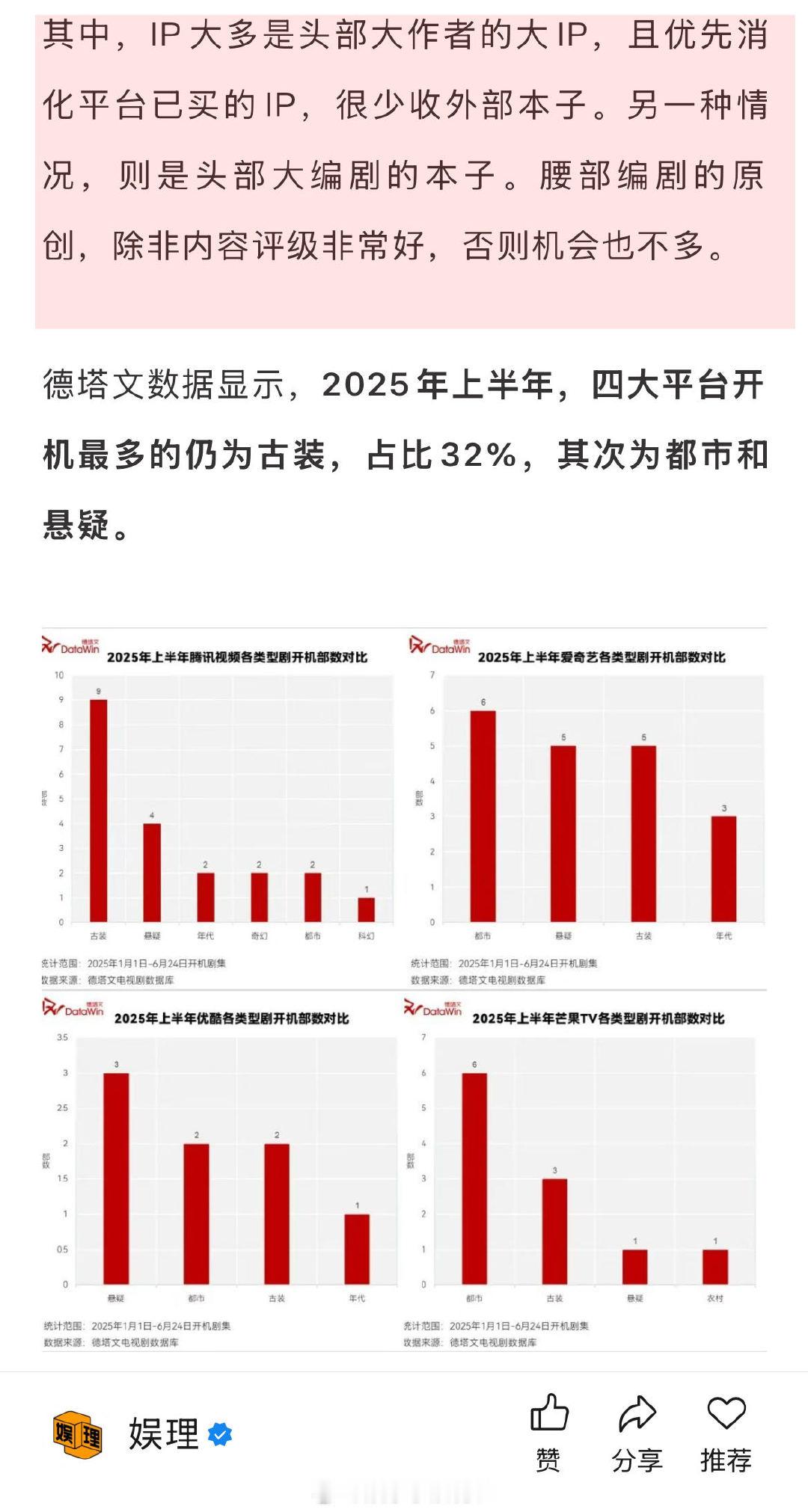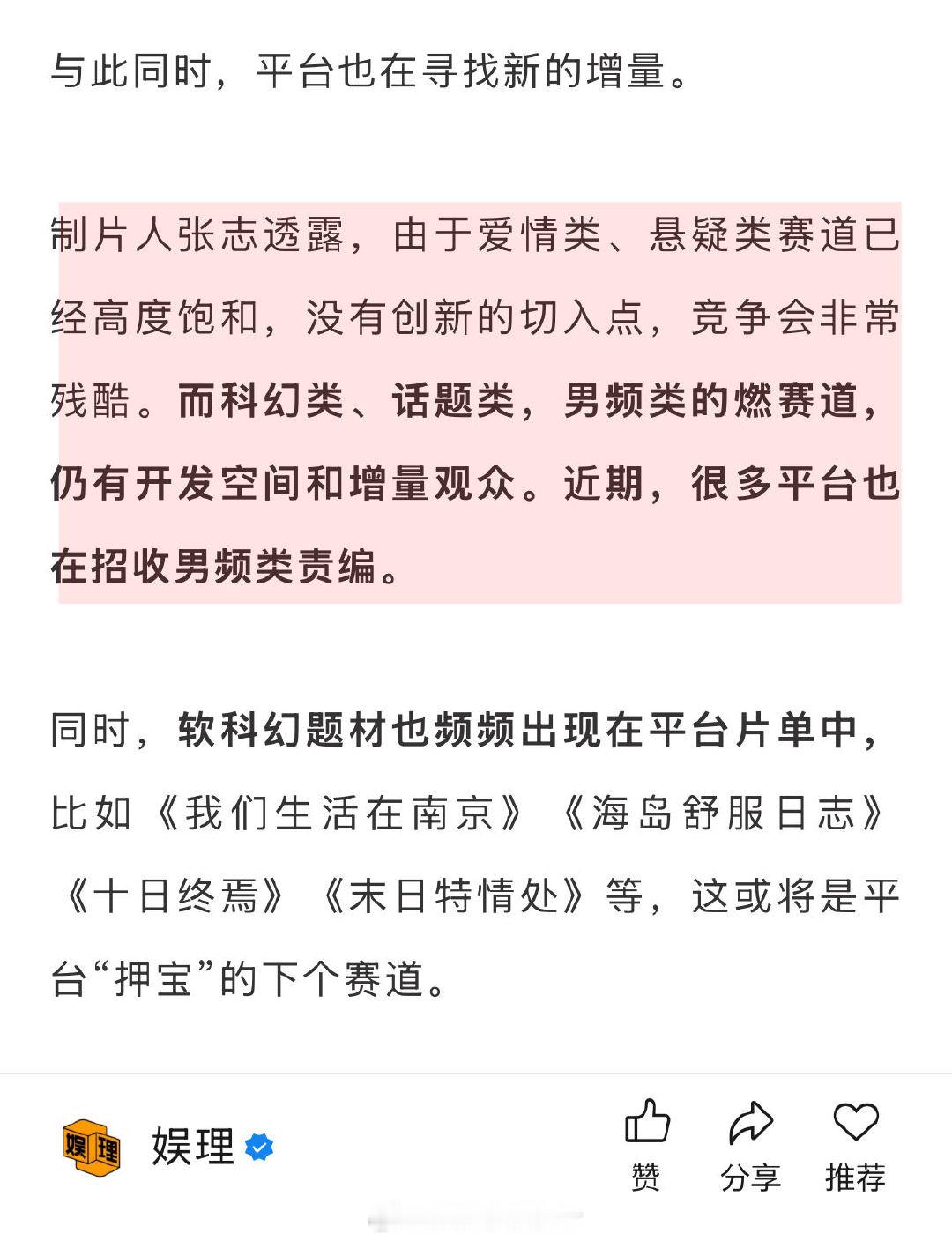 多位业内人士向 透露,容易过会的题材仍是“大IP+大流量”的古偶和“以小搏大”的低成本悬疑。另据制片人张志透露,由于爱情类、悬疑类赛道已经高度饱和,竞争会非常残酷。科幻类、话题类,男频类的燃赛道仍有开发空间和增量观众,近期很多平台也在招收男频类责编。软科幻题材或将也是平台“押宝”的下个赛道。↓