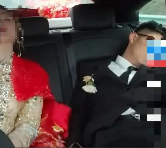 南京一对新人刚把新娘接上车,五分钟不到就头靠头睡死过去,西装歪了,头纱还翘着,亲