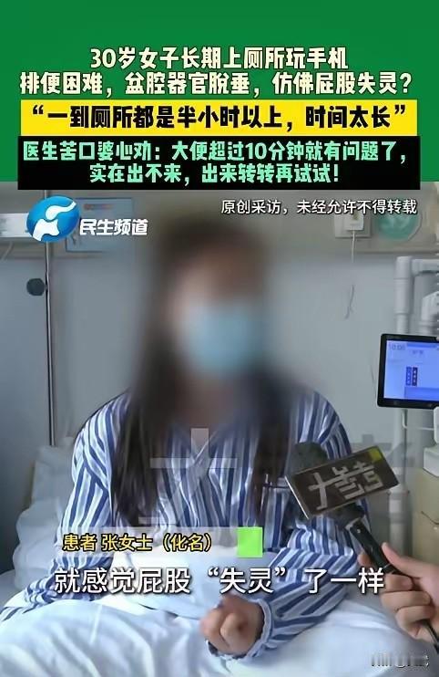 河南郑州的张女士,今年刚满30岁,平时工作压力大得像座山,吃饭也是随便扒拉两口,营养搭配根本顾不上。更离谱的是,她上厕所时手机不离手,一蹲就是半小时,屁股跟“失灵”似的,一点感觉都没有,不靠药物,一个星期都排不出来! 这一下可把张女士吓坏了,赶紧去医院检查,结果被诊断为盆腔器官脱垂。医生直摇头:“超过10分钟就有问题啦!长时间蹲着玩手机,盆腔器官压力山大,可不就‘罢工’了嘛!” 现在不少年轻人都这样,工作一忙起来,吃饭就随便对付,时间一长,肠胃就闹脾气,便秘还算轻的,就怕内脏器官跟着遭殃。张女士就是典型,对手机依赖得不行,上厕所都得带着,结果在厕所里待的时间越来越长。开始只是排便有点费劲,一二十分钟过去都没动静,后来干脆要靠药物才能解决。 这事儿给咱们提了个醒,上厕所就专心点,别老玩手机。工作再忙,吃饭也得好好搭配,别拿身体开玩笑。健康才是本钱,别等出了问题才后悔!