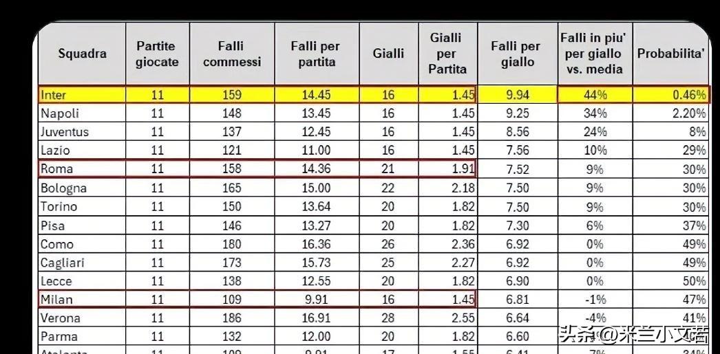 国际米兰第一!意甲联赛迄今为止犯规与得牌榜国际米兰榜首,这也与国际米兰的联赛排名相符,我记得之前发了一个数据,米兰的中场对抗都垫底了,看看榜上前几名的球队,貌似人家都有善于中场绞杀的球员,或者那种所谓的脏坏的球员, 一支球队其实需要那种干脏活累活的球员,米兰中场就是欠缺一个这样的球员。 并不是说成绩好于犯规多两者之间存在必然的联系,貌似没啥直接的指标可以证明两者之间存在必然的联系,但有因果关系,竞技体育之所以有魅力就是在竞技过程中难免有那种血性的展现,这也是竞技的一部分,大家都可惜我们当年没买科内,包括米兰中场防守下降就是从凯西离开开始的,其实都能说明一个好的防守中场作用大家是看的到的,福法纳如果安心防守还是不错的,但总是觉得差点意思,就是福法纳不属于那种脏的球员,也不是那种有点坏的球员,萨勒马克尔斯回来后,坏的咱们算有了,现在还缺少一个脏的,像当年北德容那种,或者武僧那种都行。 那不勒斯第2,尤文图斯第3,罗马第5,米兰是第12!这个帖子不要歪楼,讨论的不是裁判问题,也和金表没关系,说的就是犯规,阿莱格里一个黑又硬起家的教练吃什么细糠,福法纳能干脏活累活就安心的干脏活累活,不行就冬季窗口抓紧时间补充一个,无论是莫德里奇还是萨勒马克尔斯其实防守都不是特别强,他们都需要保护,米兰中场也需要屏障,同时需要考虑莫德里奇的年龄,有球员保护莫德里奇就能把更多精力用在防守上。