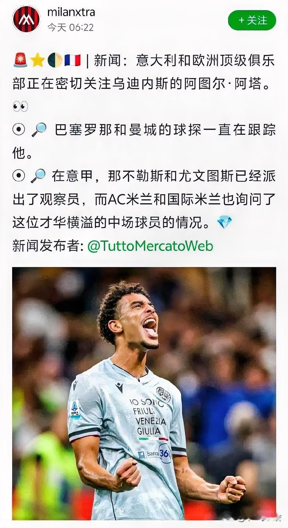 阿塔!米兰关注乌迪内斯中场球员阿塔,本赛季阿塔优异的表现吸引了多家俱乐部的关注,尤文图斯、那不勒斯与米兰双雄都对这位球员十分有兴趣。 阿塔十分年轻,只有22岁,身高189,体重77,阿塔可以胜任中场各个位置,八号位与六号位他都可以游刃有余的应对。他的技术特点完全符合阿莱格里的要求,这个阿塔的踢球风格就是小一号的拉比奥特,虽然各种能力都弱于拉比奥特,但作用十分相似,阿莱格里肯定会用这样的球员,他可以直接替换福法纳,或者做一个中场的万能替补。 这个阿塔是法国球员,不仅仅是意甲多支豪门球队对他有兴趣,曼城与巴塞罗那俱乐部也同样对球员充满兴趣,看看这堆关注的球队,米兰貌似是没啥竞争力,不过之前球员在青年队时候接受采访表示过他的偶像是德塞利,这个可能是米兰的唯一优势了。