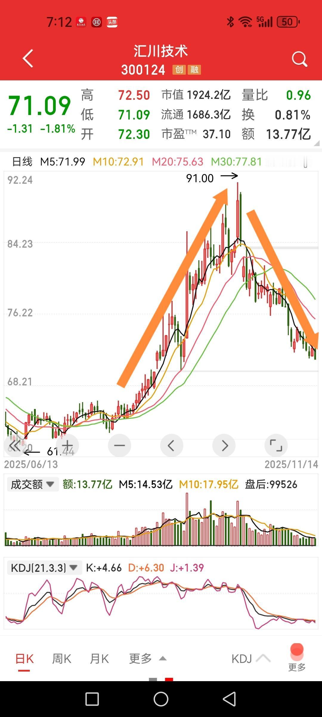 汇川技术,能吃到左边一半涨幅的人就算厉害的,恐怕也仅是十之有二者,而右边挨套的恐怕十之有七者全程被套,这就是为啥亏损总是大大多于赚钱的。 说实话我在低位就被甩出去了,当时看它磨磨唧唧的,大约是8月8号那根阴线被洗出去的,然后一路小幅攀升,看着小涨虽然懊悔却不愿买回,就这样再也当不成演员只能当观众了。记得当时注意力放到军工上了,还有手里的医药股在上涨。 现在它从高位91跌了20块,买在顶部那一堆成交密集区的,想解套恐怕要等些日子了哦。