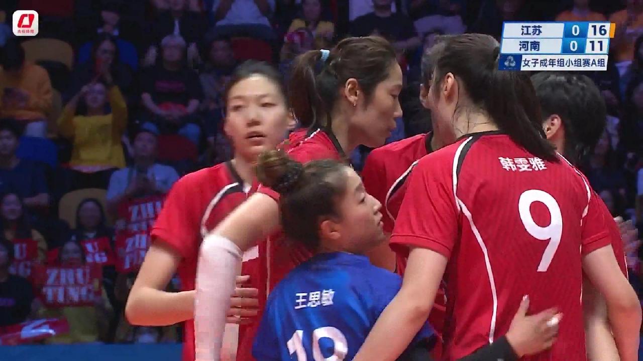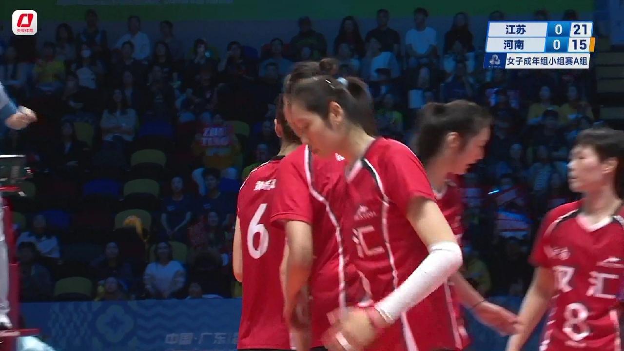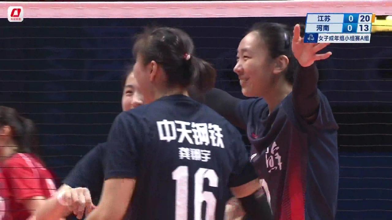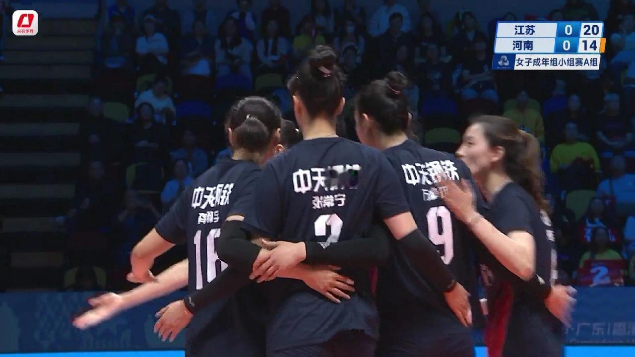全运会女排小组赛第6轮:江苏女排对阵河南女排首局25:18取胜,朱婷、张常宁隔网对轰 11月14日晚7点,全运会女排小组赛第6轮江苏女排对阵河南女排准时开打。由于江苏女排与河南女排已经双双晋级八强,这场比赛只涉及到小组排名,因此这场比赛应该是一场表演赛,但双方也非常重视。这场比赛是东京奥运会之后张常宁、朱婷两大巨星首次在比赛场上相见,澳门威尼斯人综艺馆座无虚席。 比赛一开始,双方队员就迅速进入状态。朱婷、张常宁各自代表河南女排,江苏女排,首发而且都以自己最佳的状态出现在球迷的视野。比赛打到中断。江苏女排13:10领先。然后江苏女排逐渐把比分拉开。最终江苏女排25:18先下一城。 江苏女排的首发阵容如下: 主攻:张常宁、吴梦洁 副攻:万梓玥、杨佳 接应:龚翔宇 二传:刁琳宇 自由人:倪非凡 河南女排的首发阵容如下: 河南女排的首发阵容如下: 主攻:朱婷、韩雯雅 副攻:李若琦、黄瑞蕾 接应:段梦可 二传:张梓涵 自由人:王思敏 比赛第2局正在进行,江苏女排5:4领先。 江苏 天津 河南 上海 北京