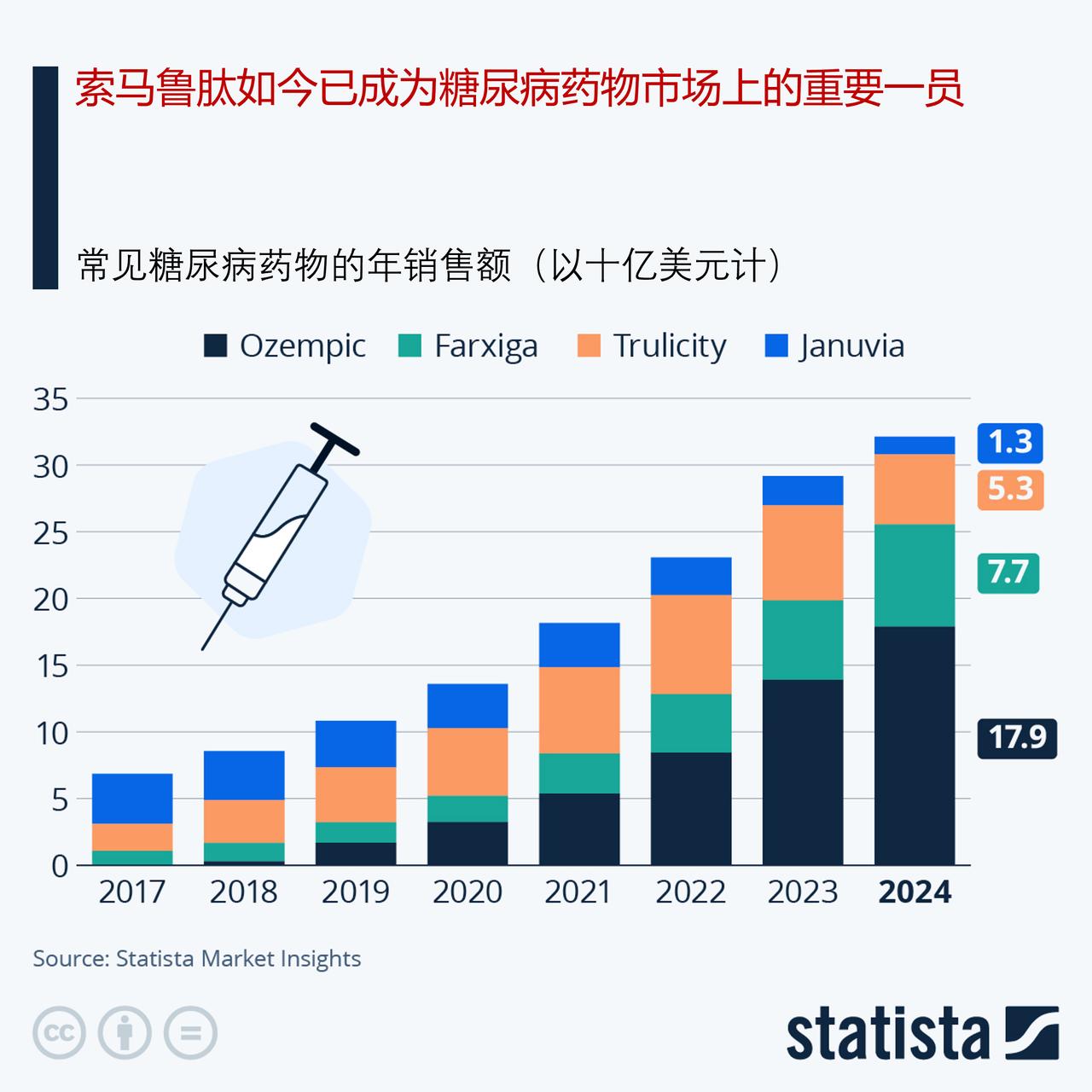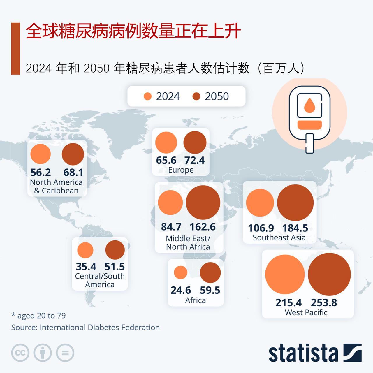 糖尿病病例数量正在上升,索马鲁肽如今已成为糖尿病药物市场上的重要一员 每年的 11 月 14 日是世界糖尿病日。糖尿病是一种慢性疾病,其特征是血液中糖分过多(即高血糖症),这可能是由于胰腺无法产生足够的胰岛素,或者是因为身体无法正确利用其产生的胰岛素所致。糖尿病分为两种类型:1 型糖尿病属于自身免疫性疾病,不可逆转,通常在儿童或青少年时期突然发病;而 2 型糖尿病(占糖尿病患者的 92%)则是在数年时间里逐渐形成的。 据联合国统计,自 1980 年以来,糖尿病患者人数几乎增长了四倍,该疾病的患病率仍在持续上升,尤其是在低收入和中等收入国家。在美国,美国疾病控制与预防中心(CDC)在 2021 年记录的糖尿病患者人数为 3840 万,占总人口的 11.6%。 据国际糖尿病联盟(IDB)的数据,2024 年全球范围内年龄在 20 岁至 79 岁之间的糖尿病患者人数达 5.89 亿。这一数字占该年龄段全球人口的 11.1%。预计到 2050 年,患有该疾病的成年人总数将增至 8.53 亿(占全球人口的 13.0%)。 预计到 2050 年,非洲的病例数将比 2024 年的 2460 万增加超过 140%,达到 5950 万。而在欧洲,2024 年估计有近 6600 万成年人患有糖尿病,这一数字预计到 2050 年将增至 7200 万。国际糖尿病联盟指出,全球范围内,糖尿病现已成为十大致死原因之一,对公共卫生构成了严重且不断加剧的挑战。 如以下图表所示,去年东南亚和西太平洋地区是糖尿病患者人数最多的两个地区,分别有 1.07 亿和 2.15 亿成年人患有此病。在南亚的印度,患有糖尿病的成年人数量位居第二,为 8980 万人,仅次于中国。预计到 2050 年,这一数字将增至 1.567 亿,增长 74.5%,糖尿病患者的年龄标准化患病率预计将达到 13%。 在世界许多国家,诊断不足的问题依然十分严重。去年,在印度,几乎每两个患有糖尿病的成年人中就有一个未被诊断出(占 42.7%)。在全球范围内,这种差异依然存在。据预测,到 2024 年,在高收入国家中,20 至 79 岁的成年人中未被诊断出患有糖尿病的比例为 28.9%,而在中等收入国家这一比例为 45.5%,在低收入国家则为 58.7%。 据美国国立卫生研究院称,未确诊人群比例最高的地区位于非洲、西太平洋地区和东南亚,这三个地区均包含大量农村地区。“由于资源匮乏、难以获得医疗保健服务以及优先考虑其他健康问题等因素,这可能导致难以识别未确诊的糖尿病病例。” 如下面图表所示,根据 Statista 收集的数据,丹麦制药巨头诺和诺德的糖尿病治疗药物索马鲁肽(Ozempic)自 2018 年首次商业化以来,其营收增长迅速,从当年的约 2.8 亿美元增长至 2024 年的近 180 亿美元。索马鲁肽很快超过了其部分竞争对手,包括德国制药公司默克旗下的雅努维亚(Januvia),后者其营收从 2017 年的 37 亿美元降至去年的 13 亿美元。阿斯利康的达格列净(Farxiga)在其 2017 年至 2020 年期间营收增长缓慢,从 2021 年开始增长更为迅速,而礼来公司的糖尿病疗法度拉鲁肽(Trulicity)的营收在 2017 年至 2022 年间稳步增长,但在 2023 年和 2024 年有所下降。