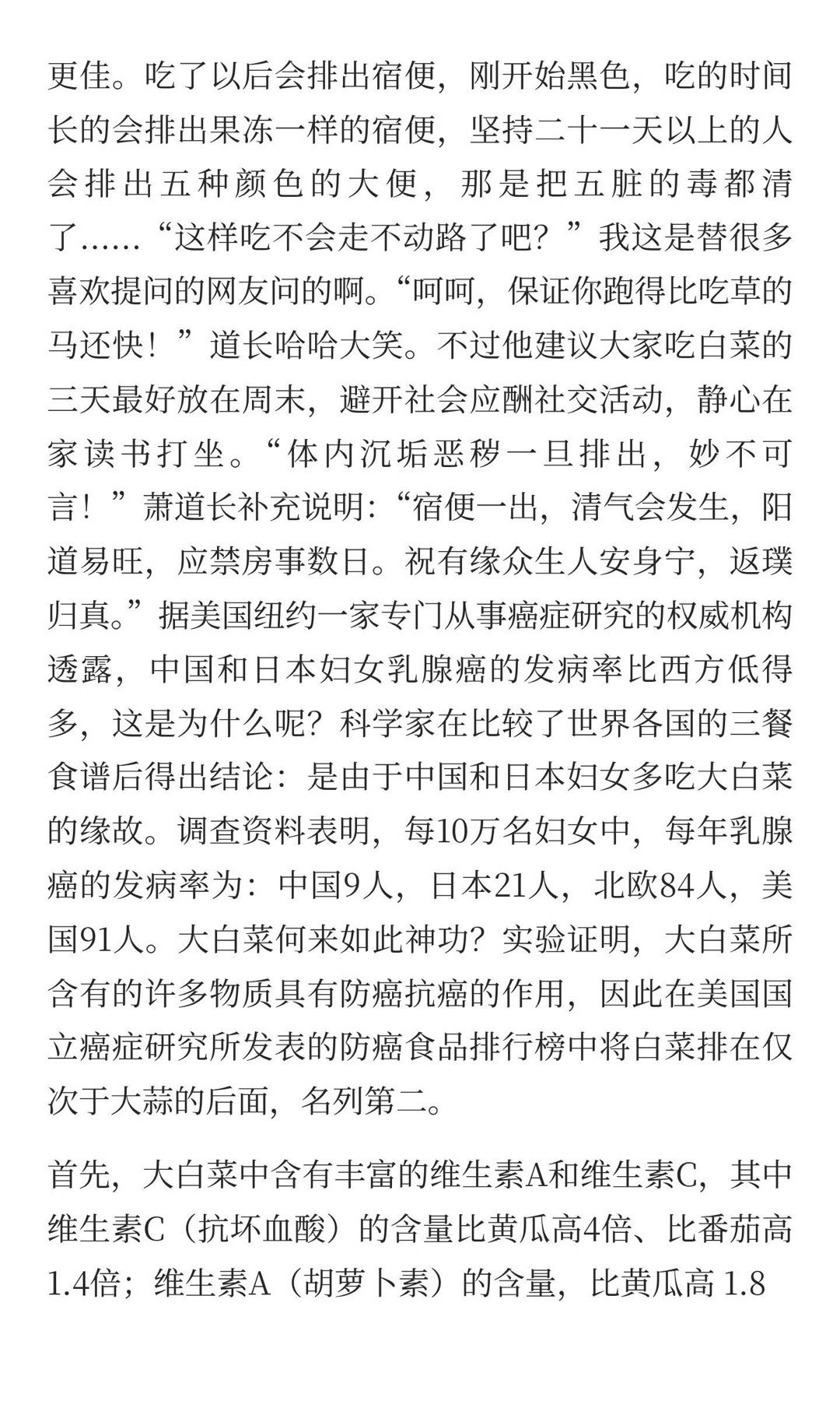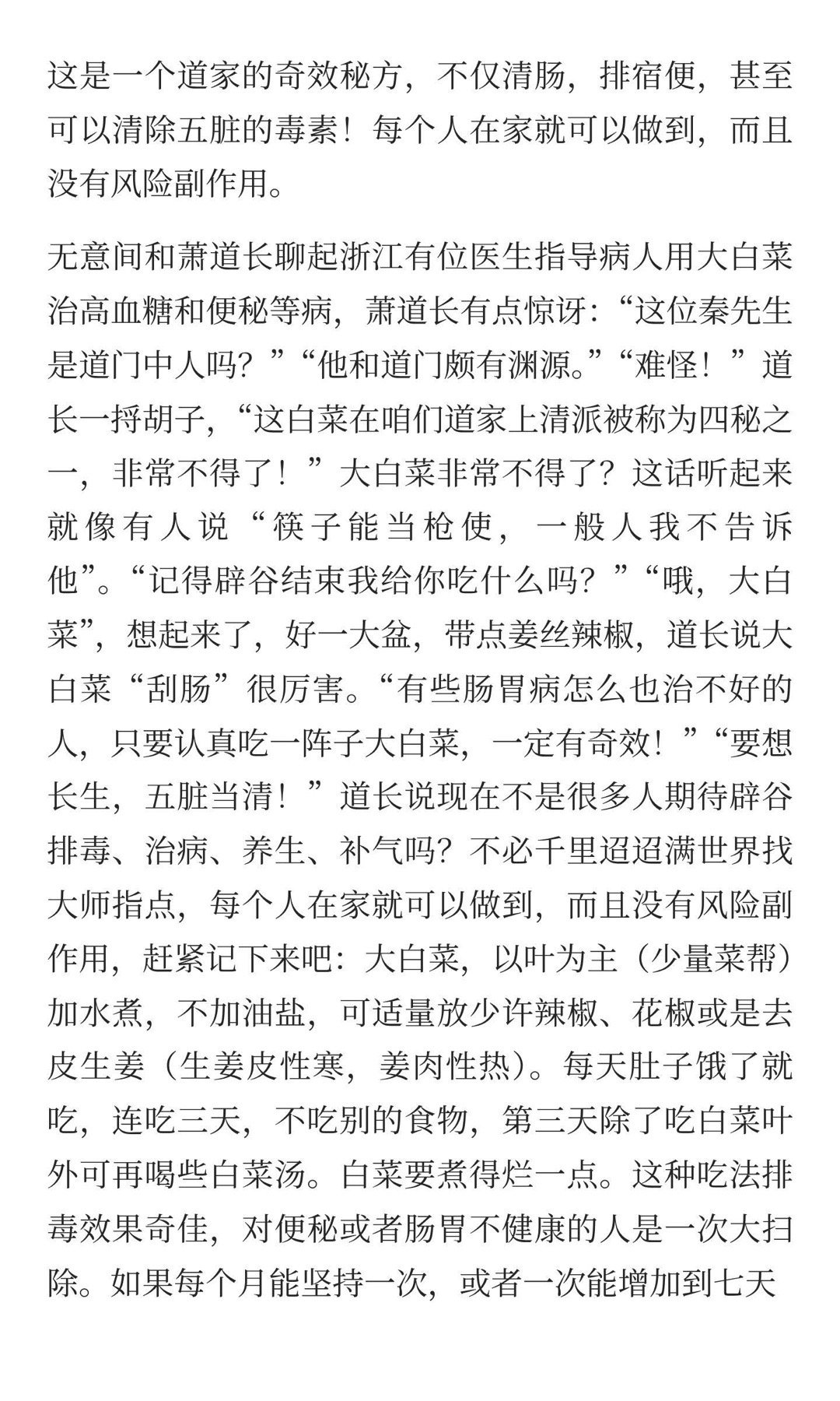 分享:一个道家能迅速排五脏所有毒素的千古大白菜是道家秘方,清肠排毒,清除五脏毒素。每天煮白菜叶,不加油盐,连吃三天,排出宿便和五种颜色的宿便,改善肠胃健康。坚持食用,阳气易旺,防癌抗癌。