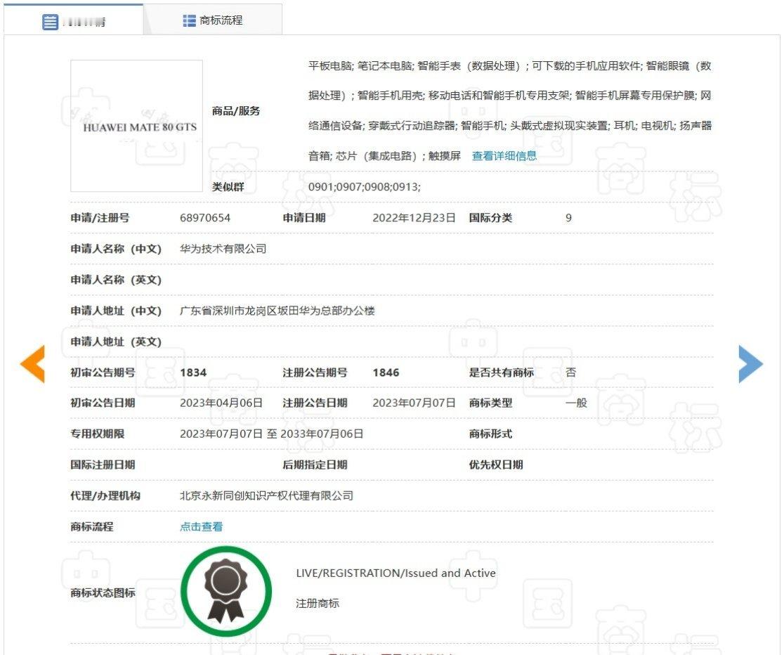 【华为已注册 HUAWEI MATE 80 GTS 商标,商品 / 服务范围含智能手机等】近期多个平台流传华为 Mate 80 系列将推出“GTS”新机型。国家知识产权局商标局显示,华为确实已注册 HUAWEI MATE 80 GTS 商标,商品 / 服务范围含智能手机、平板电脑、智能手机用壳、网络通信设备、智能手机屏幕专用保护膜等。需要注意的是,Mate 80 GTS 机型是否会推出须以华为官方信息为准。因为除了 HUAWEI MATE 80 GTS 商标外,华为还注册了 HUAWEI MATE 100 GTS、HUAWEI MATE 90 GTS、HUAWEI MATE 70 GTS、HUAWEI MATE 60 GTS、MATE GTS 等商标,然而 Mate 70 / 60 系列暂未推出 GTS 机型。华为 Mate 80 系列将包括两个主要版本,分别为代号 Voyager 和 Sagittarius 的标准版和 Pro 版,这两个版本在充电配置上有所区别:标准版将配备 66W 有线充电技术,Pro 系列将采用 100W 有线充电技术,系列新机还有望全系搭载 3D 人脸。另外,华为 Mate 80 系列旗舰工程机还被曝在 Deco 下部搭载散热风扇,拥有真正的风道散热鳍片做了“小型化精密封装”,并拥有防水结构,出风口在 Deco 侧边。爆料称这台工程机搭载风扇是为了影像和芯片准备,但不确定是否能落地。