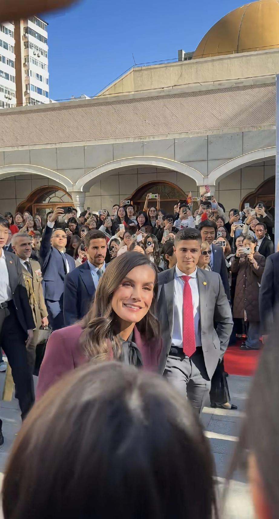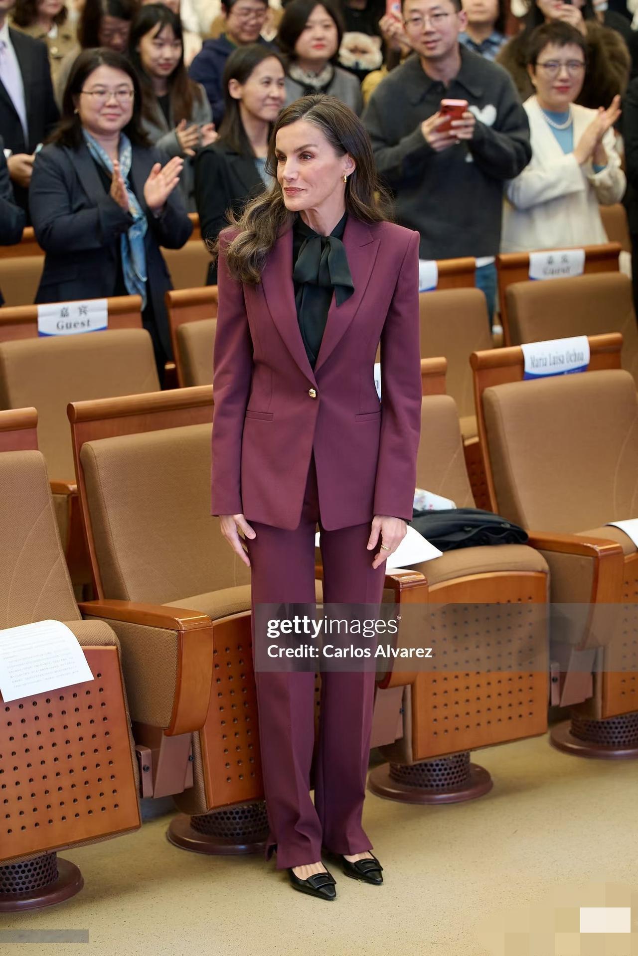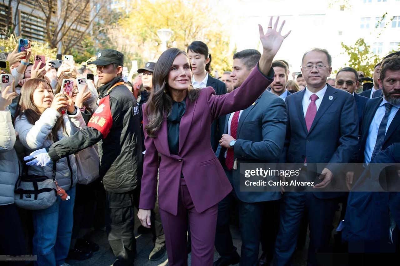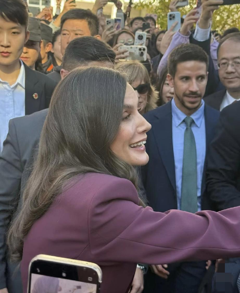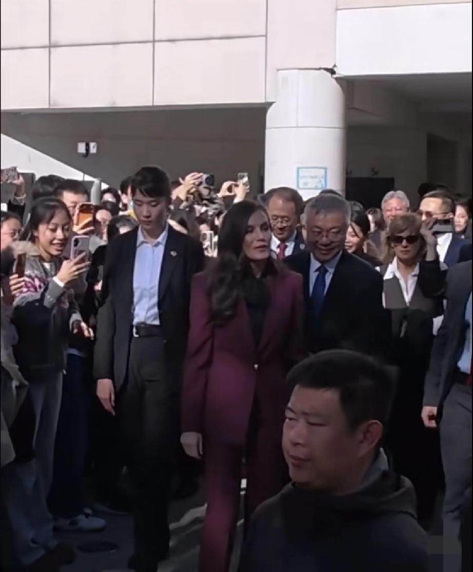 永远不要怀疑王后的审美眼光,发现没?脱下牡丹花大衣,换上一身深红色职业套装,配黑色真丝绑带衬衫现身北京外国语大学的她,虽没说话,但衣服替她说了,这波不同场合的着装礼仪,实在太过优雅得体又不失高级! 不得不说,1972年的罗卡索拉诺王后虽说已年过半百,近距离下都有白头发了,但颜值气质依旧在线,现场热情伸手跟学生打招呼,一颦一笑间,美得格外优雅大气又迷人。果然岁月从不败美人啊!