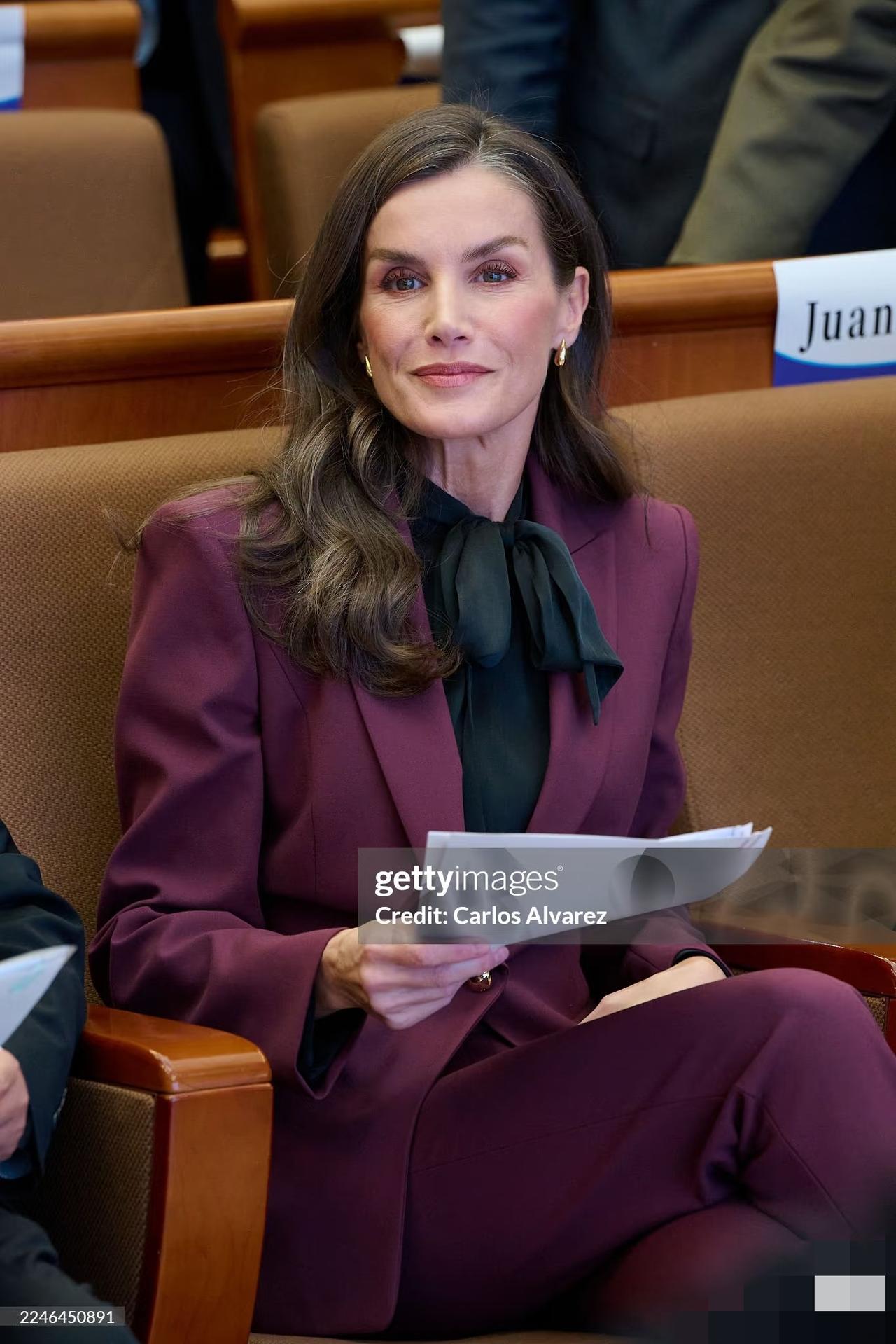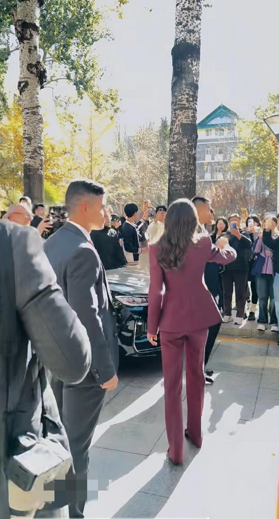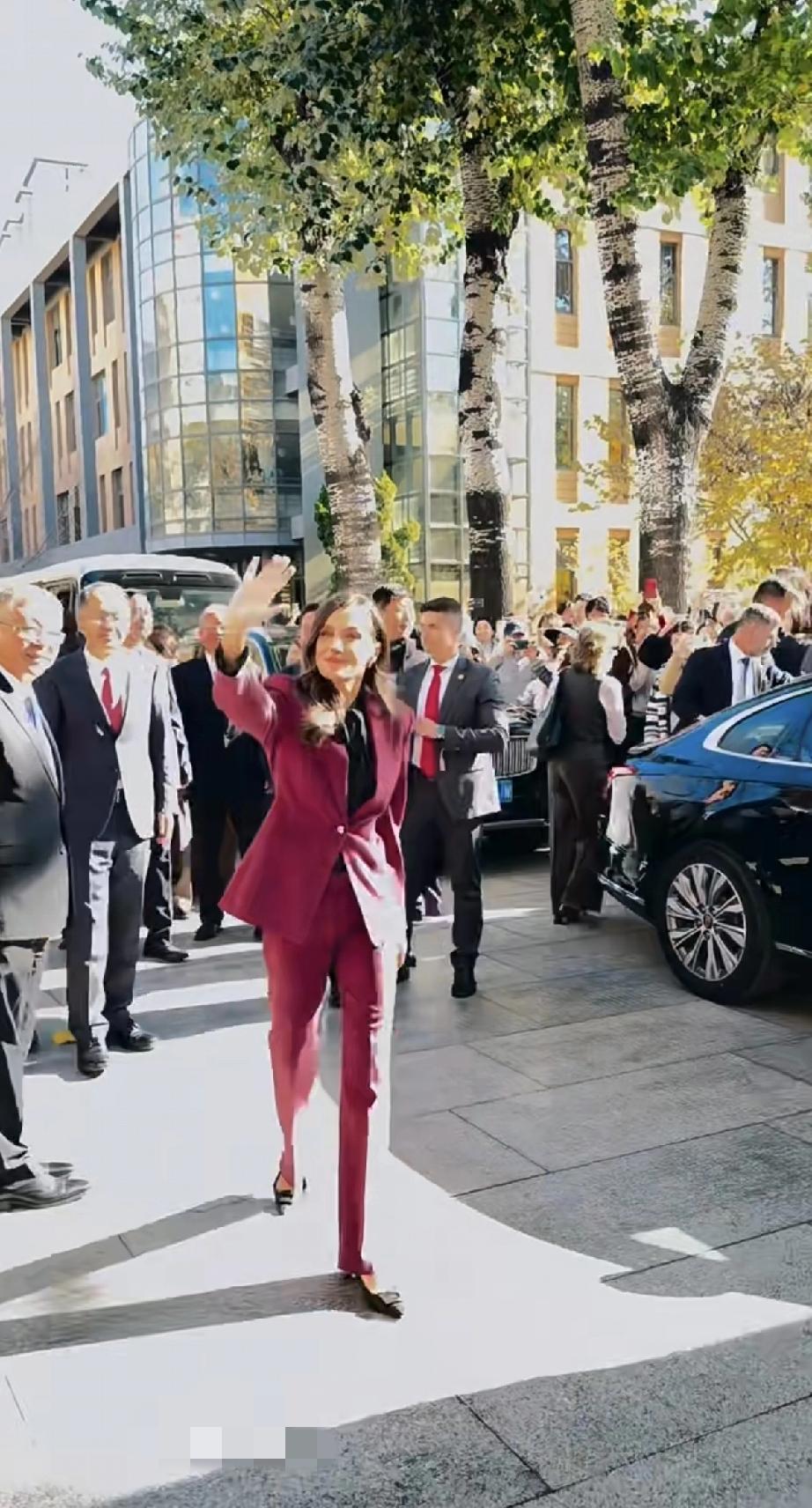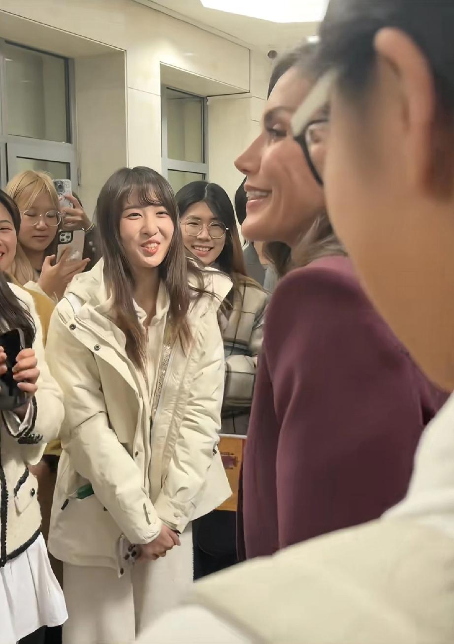 永远不要怀疑王后的审美眼光,发现没?脱下牡丹花大衣,换上一身深红色职业套装,配黑色真丝绑带衬衫现身北京外国语大学的她,虽没说话,但衣服替她说了,这波不同场合的着装礼仪,实在太过优雅得体又不失高级! 不得不说,1972年的罗卡索拉诺王后虽说已年过半百,近距离下都有白头发了,但颜值气质依旧在线,现场热情伸手跟学生打招呼,一颦一笑间,美得格外优雅大气又迷人。果然岁月从不败美人啊!