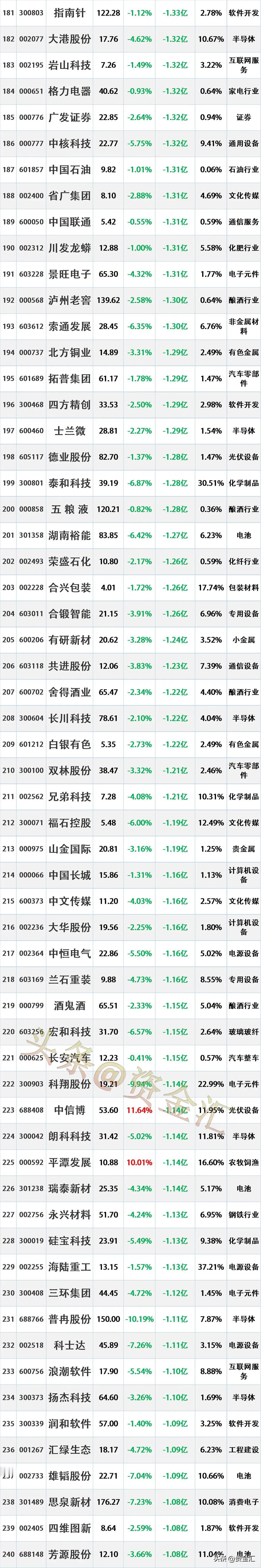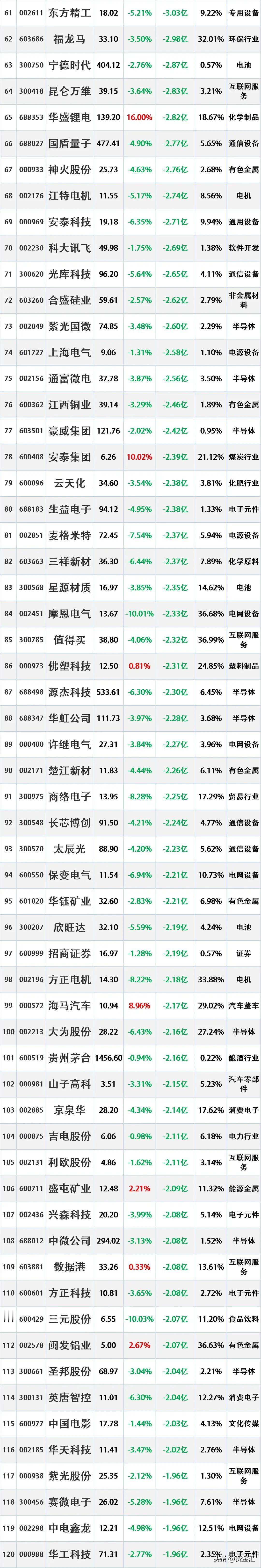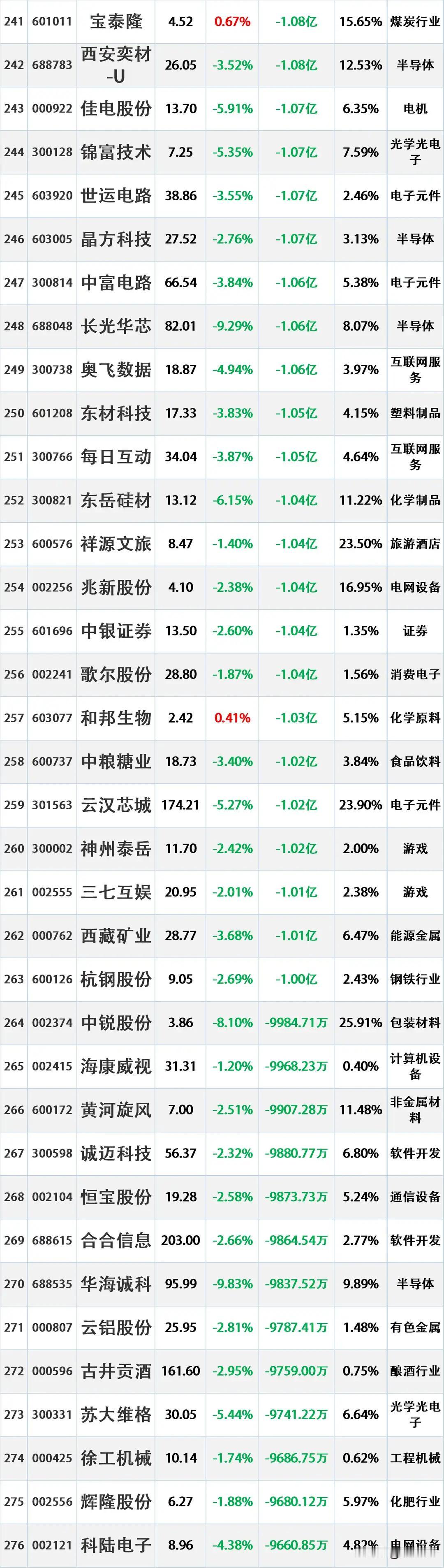 尾盘资金出逃,11月14日主力资金大幅流出的股票名单。 资金流出是指在一定时期内(如一天、一周等),主动卖出某只股票的资金量大于主动买入该股票的资金量。主动卖出是指投资者以买方的报价直接成交,显示出投资者对该股票的消极持有或抛售意愿。