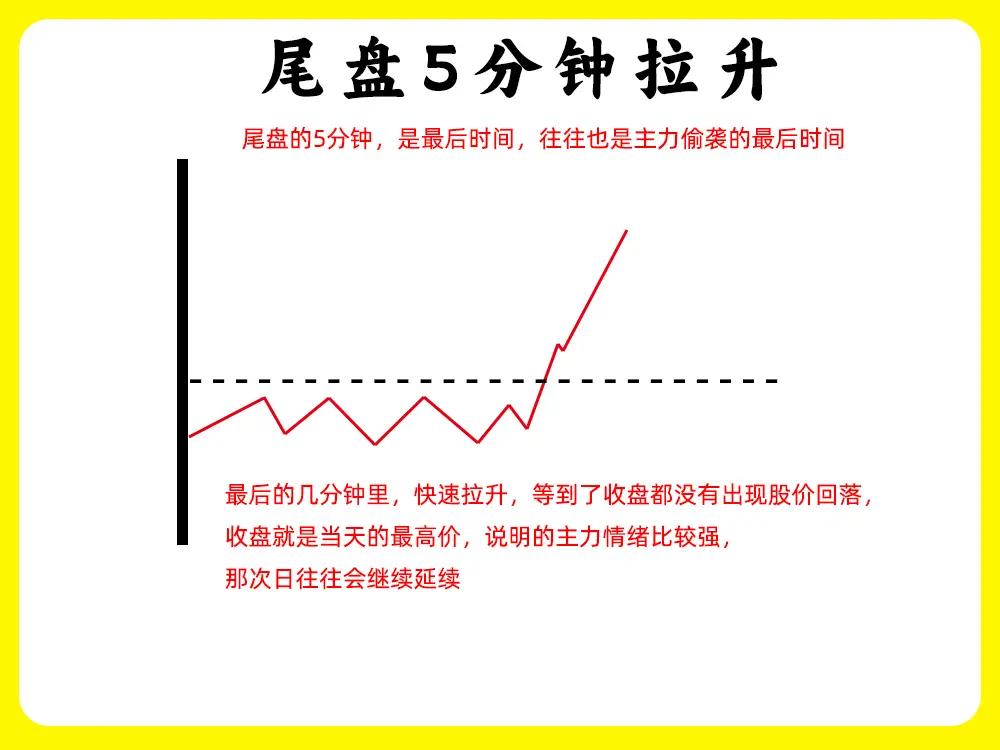 股票投资言简意赅的总结(收藏学习): 1. 尾盘急跌:股价全天高位运行,尾盘却突然大幅跳水、成交量放大,通常是主力在出货。 2. 尾盘5分钟拉升:尾盘最后几分钟股价快速拉升且收盘不回落,说明主力做多意愿强,次日可能继续上涨。 3. 均价线博弈:股价在均价线上方运行或尾盘站稳均价线为强势信号,跌破并在下方运行则偏弱。 4. 震荡洗盘:股价先拉升后回落跌破均价线,震荡整理后再突破站稳,为洗盘后重新走强。 5. 成功试盘线:股价回踩关键支撑(试盘线)不破,是主力试探下方承接力,为后续拉升做准备。 6. 试盘后大涨:试盘线出现后,次日拉出大阳线,显示主力试盘成功,股价进入上涨阶段。 7. 启动型涨停:股价在低位拉出涨停板,是主力强势控盘信号,尤其配合放量涨停后缩量回调更健康。 8. 突破前高:股价以中大阳线或涨停突破前期高点(套牢区),即“放量过左峰”,打开上涨空间。 9. 黄金缺口:出现向上突破型缺口且短期内不回补,预示强势行情,具有强支撑与压力意义。 10. 底部连阳:股价在低位连续收出小阳线(至少六连阳),底部逐步抬高,是主力吸筹的常见形态。 总体核心提炼: 这10张图集中讲解了股价走势中的关键形态与主力行为信号,包括尾盘异动(急跌/拉升)、均价线博弈、洗盘与突破、试盘与确认、涨停启动、突破前高、黄金缺口、以及底部吸筹连阳等,旨在帮助识别主力意图与股价未来可能的动向,为判断买卖时机提供技术参考。