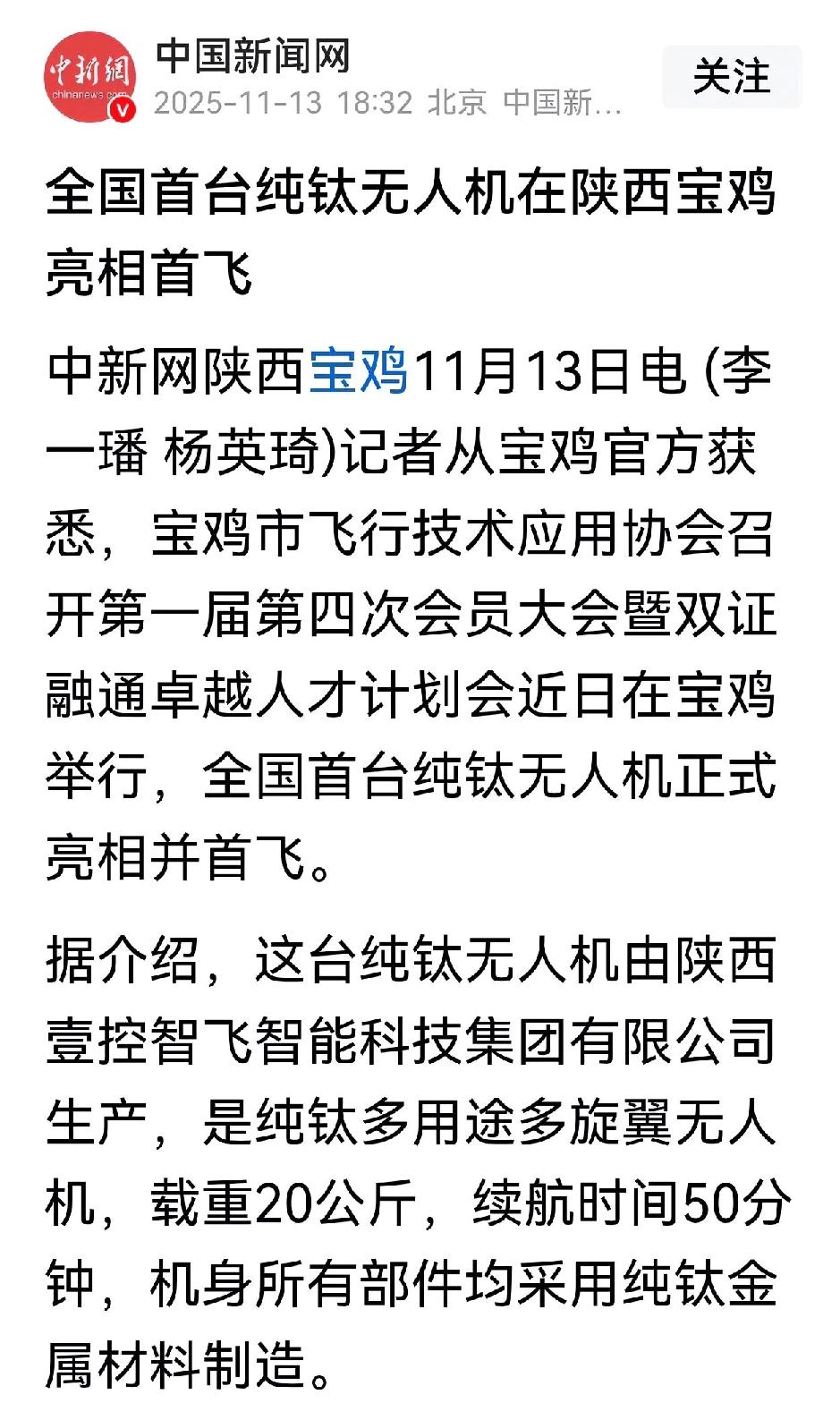 宝鸡无人机制造总算国字号的媒体报道啦[击掌][击掌]刚才刷手机看到位于宝鸡蟠龙新区的陕西壹控智飞制造的全国首台以纯钛合金制造的物流运输的无人机首次试飞成功,就觉得很不错。毕竟这是“出生”于何尊老家贾村塬的高技术无人机第一次在全国首飞成功。 就在前几天还为壹控智飞拍摄视频新闻呢 这会就看到中国新闻网的新闻报道,实在是高兴😆。其实宝鸡还是有很多高新技术的性的企业的,就是吃亏在西北,不被外面世界的人们所关注而已。 中国🇨🇳个国名都源自宝鸡出土地何尊,但为何宝鸡就不为人知呢?搞得宝鸡的企业也不为人所认知。宝鸡啊,宝鸡的官方啊,你就应该高调宣传自己才是,尤其是宝鸡的文化和旅游部门,你们工作落后啦!赶紧与时俱进吧!
