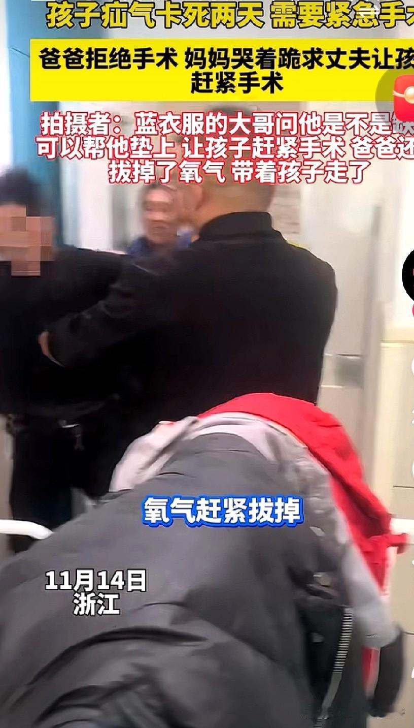 把疝气的孩子硬生生拔下氧气管带走的父亲正常吗 有什么可以阻止他这么做? 孩子疝气据说已经卡住了,这个病听说过,不是大病啊,手术就好,就是我前年提过的北理毕业现在在华为工作的小伙子,人家什么都好好的。 手术也没多大,孩子妈都跪下来求爸爸,还有个好大哥拦着爸爸,说你是不是缺钱,不够我给你垫上,给那位大哥一个赞许的眼神。 但是爸爸依然疯了似的推开老婆,推开大哥,冲到孩子病床强行拔下氧气给孩子带出医院。 我活了也几十年了,天经地义以为父母对孩子的爱无私无求,就是因为孩子是我的爱和希望,看着他成长无比幸福,他吃比我吃香,他穿比我穿美。 所以这样的父亲超过我的心海了! 他要干嘛呀!这时候不是拼命救孩子吗? 有些人上帝给他孩子真是错付! 问题是当妈的怎么就说了不算,还得给他跪下求他,我和很多女人一个想法,你动我儿子?我豁出一切都不带干的!那是我用我心血换来的[呲牙]!