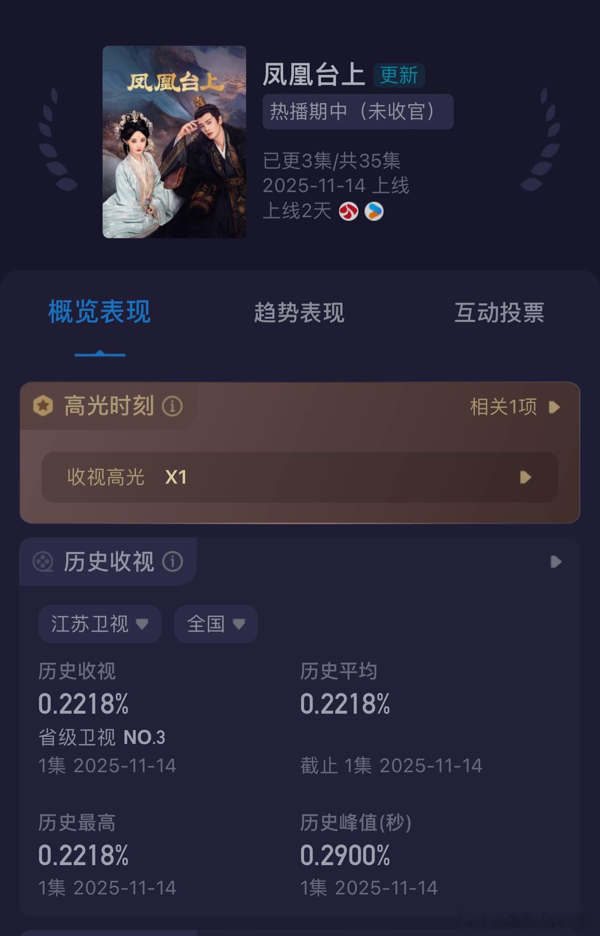 任嘉伦、彭小苒 首日播出数据热度,播前6032,最高6903,➕871拉新,播前3580.56,最高3597.72,➕17.16首日灯塔596.3预计两云播放量430万左右低于我预期,我本来以为首日热度能到7500,播放量能到800-1000万 最高7036招商4品牌,总时长152s酷云收视率首日0.2218,峰值0.29
