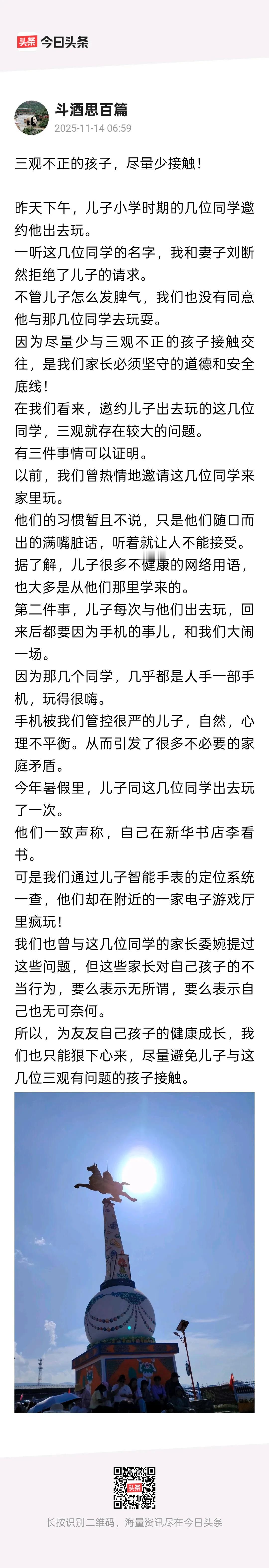 家长说不让孩子跟三观不正的小孩在一块玩,评论区却都在批评家长。 这个家长发的这个微头条挺有意思,说禁止孩子跟那些三观不正的小孩一块玩。 在他口里的三观不正,其实只有三件事儿,第1个就是这些小孩集体说脏话,第2个小孩人手一个手机,第3个小孩为了自己能玩游戏跟家长说谎。 坦白来讲,家长想让自己孩子远离有这些行为的朋友,也是可以理解的。 但是评论区网友说的很好,这其实是家长变相控制自己的孩子。 孩子终究有一天会离开父母的,会有他自己的生活,他需要有同伴的安慰,同伴的支持,同伴的陪伴,而这些是家长没办法提供的。 即便是家长口中的三观不正,那也都只是一些小毛病,是他们这个年龄的群体,所特有的一种特征 如果现在都禁止孩子跟这样的人交朋友,可能孩子以后就不会有朋友了。 这个网友的评论一针见血。 其实网友说的也看出来了,这个家长对孩子的控制欲太强了 什么都得按照他的标准来,这样以至于让孩子会产生逆反的心理,尤其是现在控制孩子交朋友,可能以后孩子就没办法自己交朋友了,这对他以后来讲是一个极大的考验