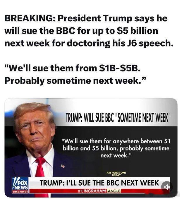 川普天价起诉BBC!川普刚刚对媒体表示,下周将起诉英国BBC,可能要求赔偿金额10-50亿美金。BBC官方自己承认了造假抹黑川普。在川普私下要求给予经济赔偿时,BBC却耍赖了。BBC竟然大言不惭的说:我们的确造假抹黑了川普,但川普不还是当上了总统吗?😂😂😂见过不要脸的,没有见过这么不要脸的。 BBC你死定了。✌️✌️✌️