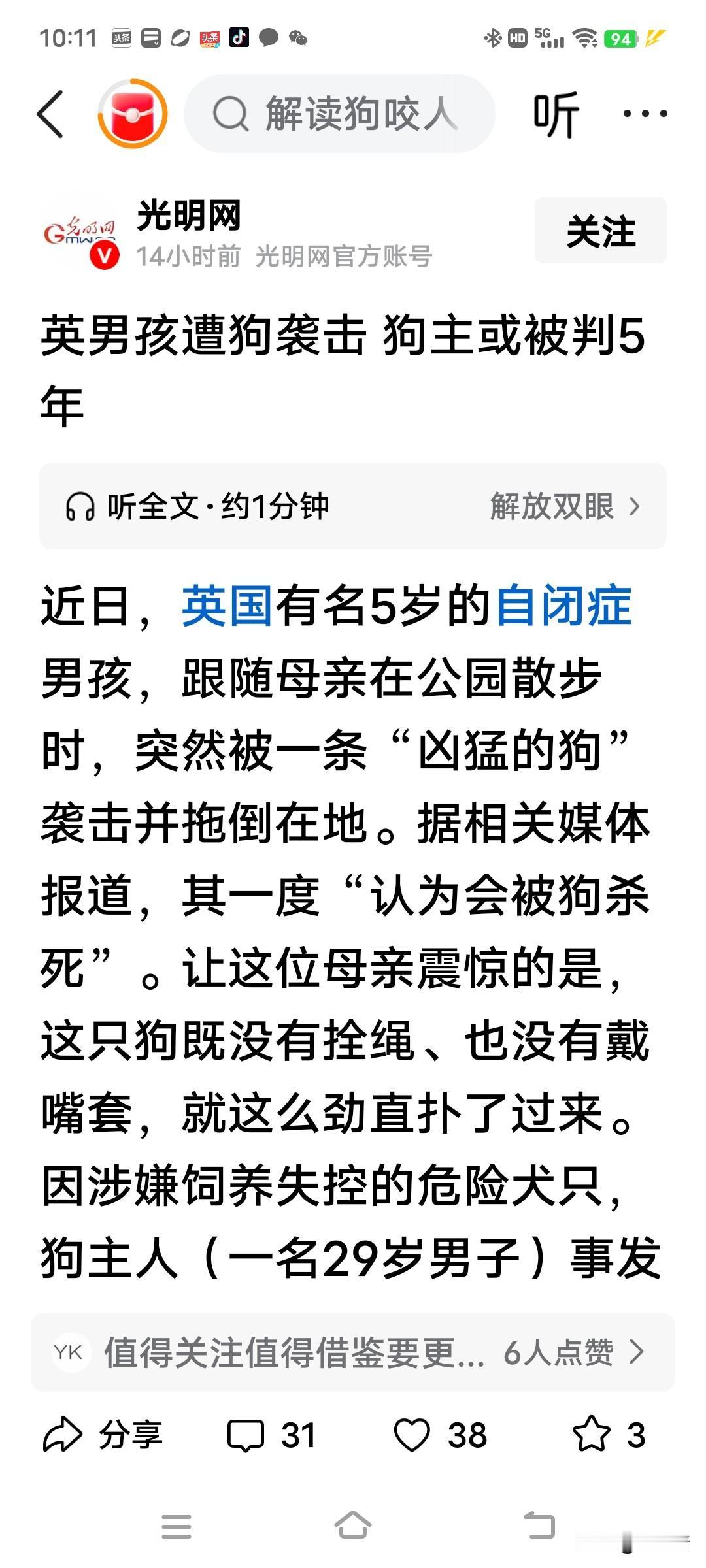 儿童被恶犬咬到,养狗主人或被判刑5年。英国养犬责任重大,制定法律,狗咬到人主人要蹲大牢的。 这是一个五岁自闭症儿童,他和母亲逛街的时候,遇到一条没有带口套、没有拴绳的狗扑倒在地,儿童受到伤痛和惊吓。 遛狗的是一位29岁男子。这要是在国内,一般就是打狂犬疫苗、赔偿点费用了事。英国不行,这位29岁涉事男子要承担刑事责任,最高可判五年监禁。 如果人被狗咬至死,刑期上限14年,并可附加无上限罚款,赔偿及终身监禁。只要狗咬到人就等于坐牢。 英国人养狗责任重大。咱们啥时候也立法严格管控,狗咬人的纠纷肯定会减少。