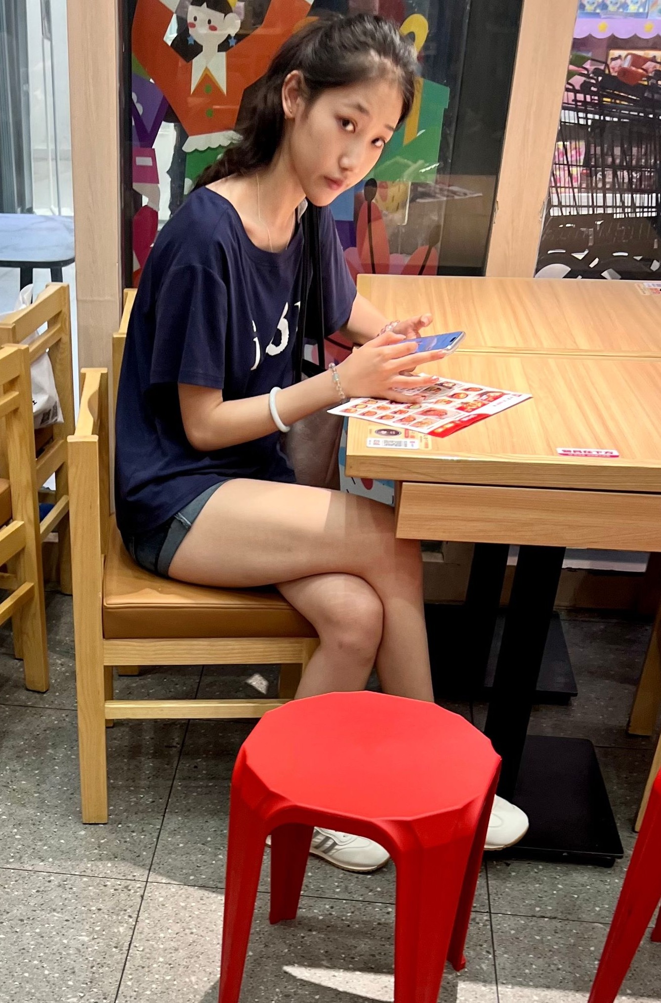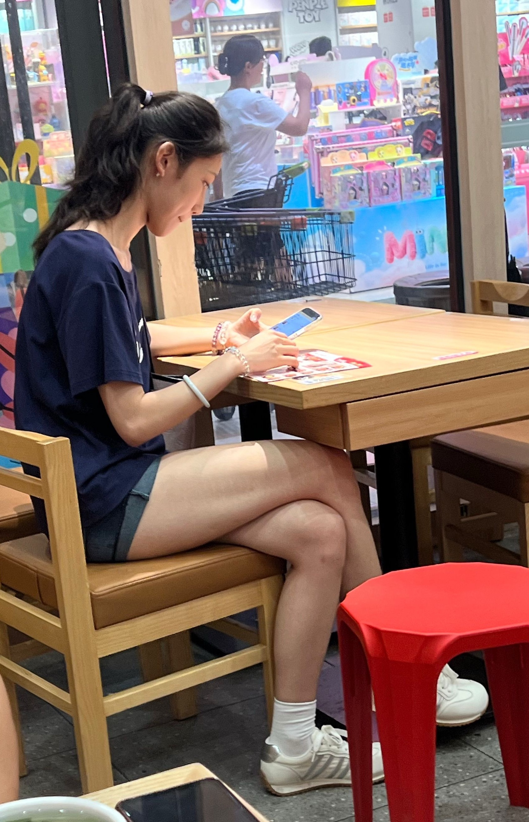 上身裹紧蓬松的黑羽绒,像揣了团软乎乎的云;下身轻摆绀色裙角,露一截细腿撞破冬日沉
