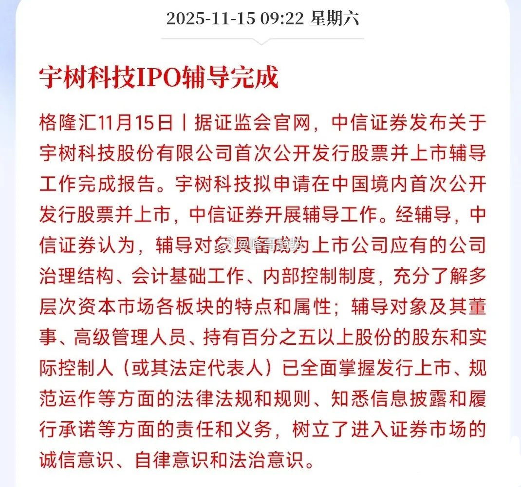 人形机器人迎来重磅利好消息,老大离上市越来越近了证监会公告宇树科技已经IPO辅导完成,也就是说宇树科技离上市也就差最后一步了。作为国内人形机器人毫无争议的老大,其上市会直接影响相关产业链,估值将会再一次提升。宇树科技IPO估值已经达到了432亿元,就在6月其估值也才120亿。不过有机构从2024年的净利润推算宇树科技的估值达到了至少342亿,上市之后随着股价的推高有机构预估市值会达到500-1000亿左右。人形机器人的配套产业链也很多,宇树科技一上市股价都会随着推高。