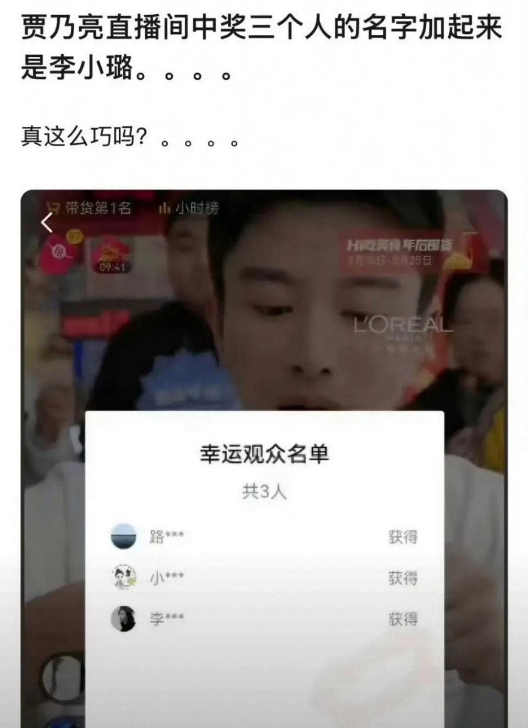 贾乃亮是不是疯了,直播间找的助理女主播长相很像前妻李小璐,随机抽奖的三位幸运观众,名字加起来也刚好是“李小路”……是真的巧合还是故意为之?就不说对李小璐尊不尊重了,天天说爱甜馨,等她发现爸爸这么蹭妈妈的流量热度,心里会怎么想这个爸爸?