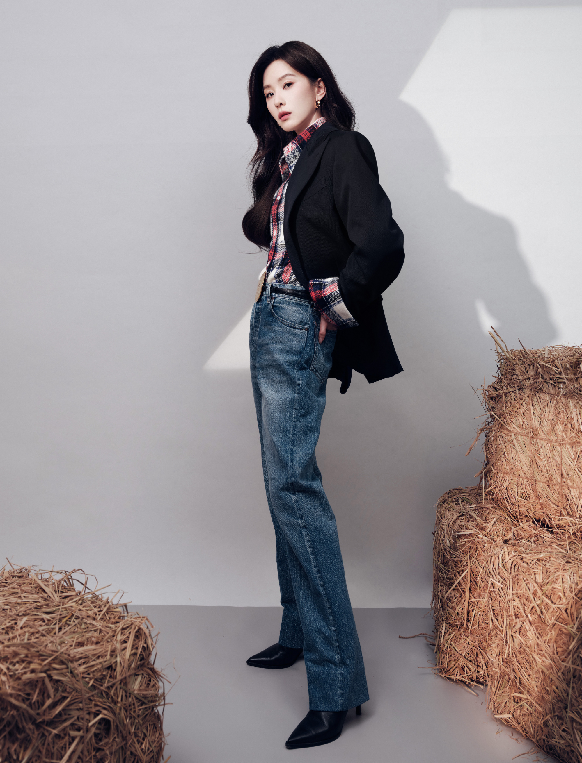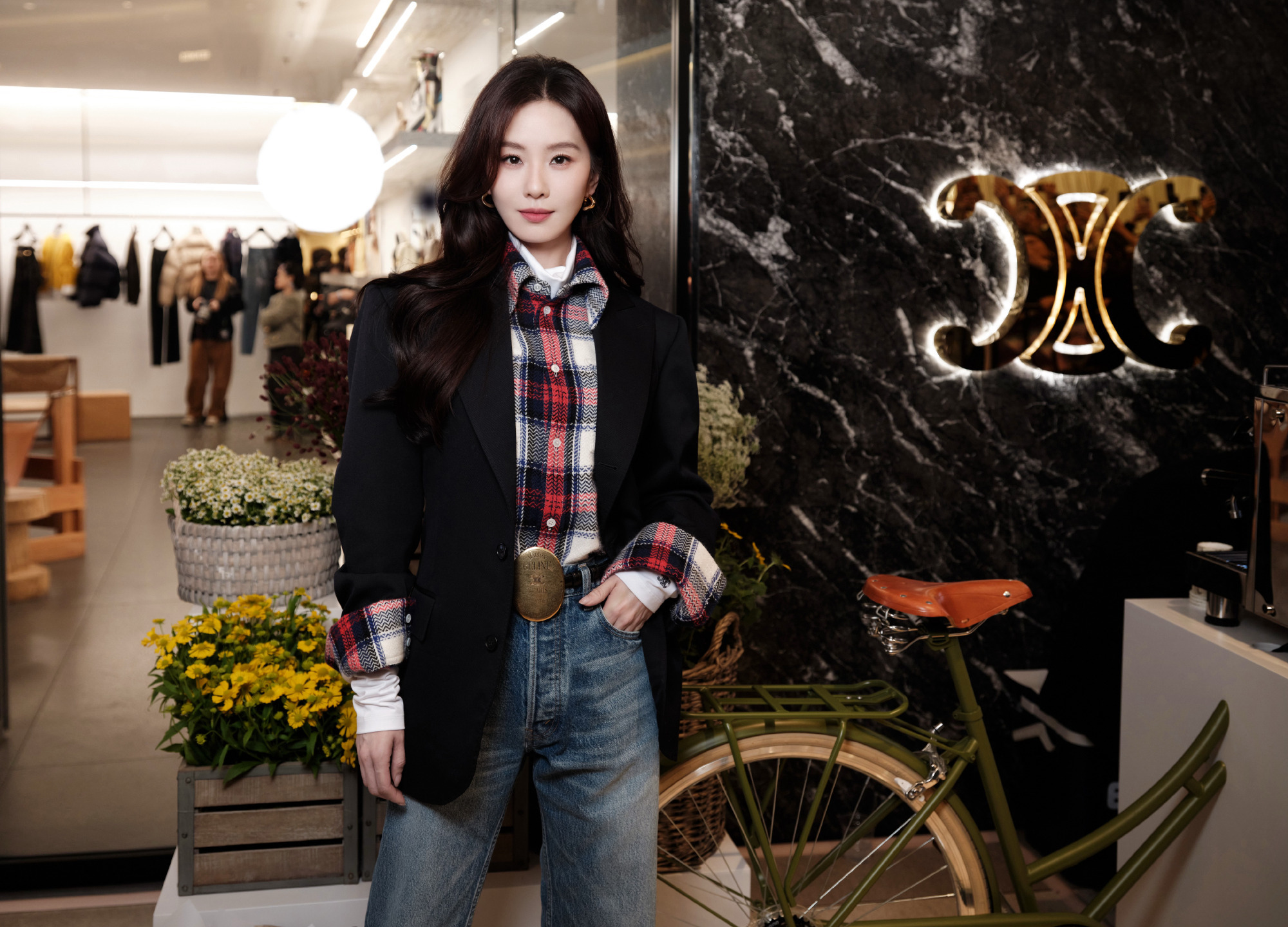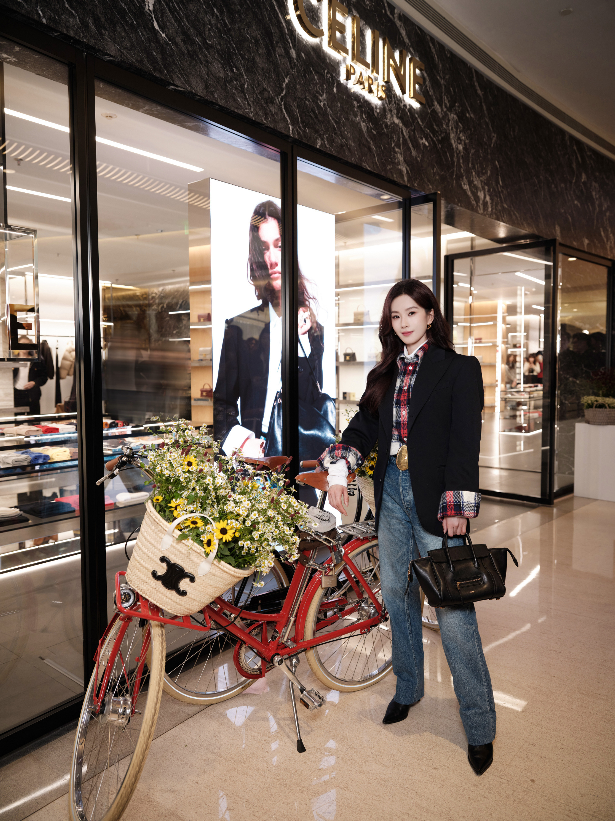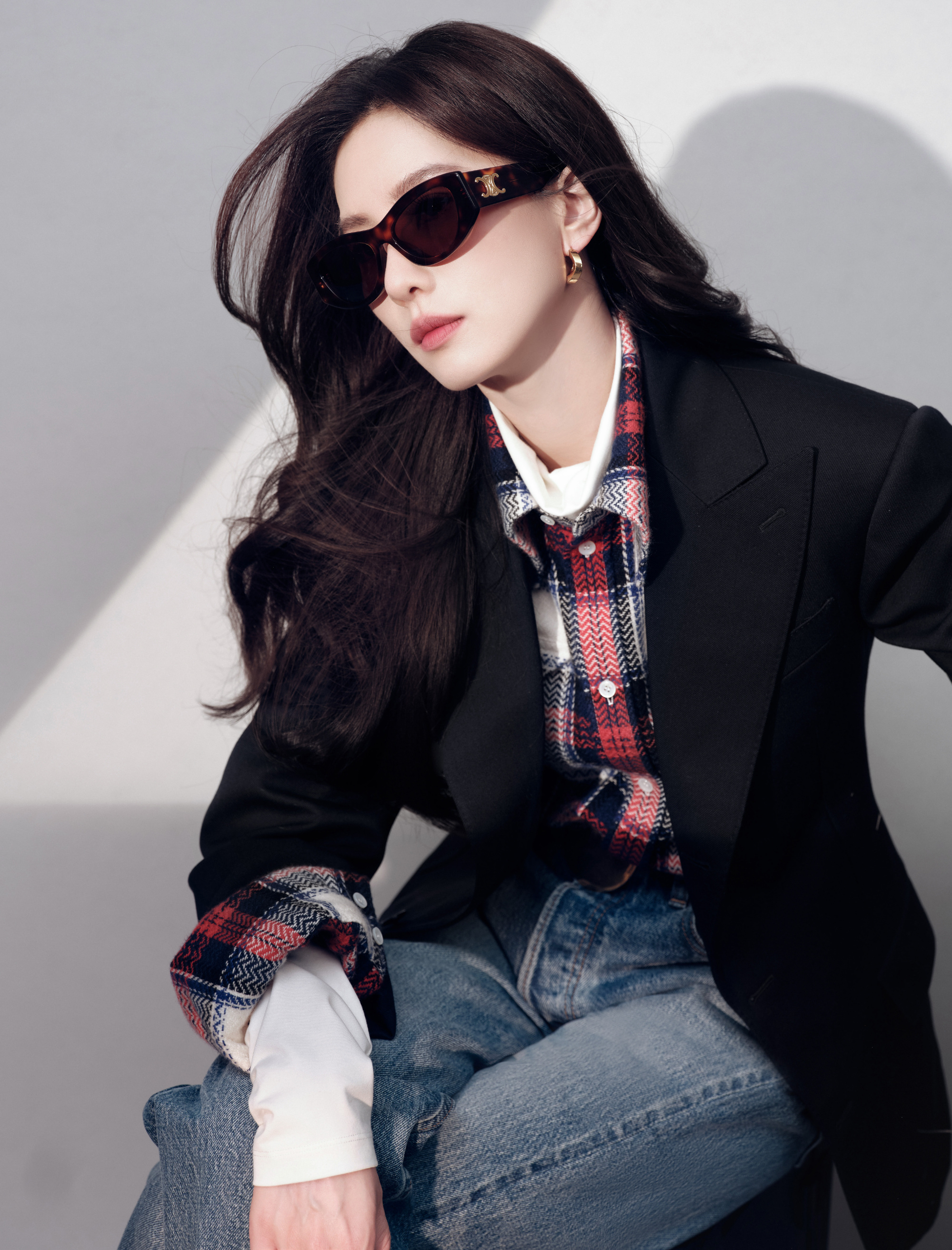 刘诗诗以CELINE全球品牌大使身份出席上海的品牌活动,她身穿 Michael Rider首秀系列的黑色廓形西装,内搭菱形格纹衬衫,同时搭配直筒牛仔裤