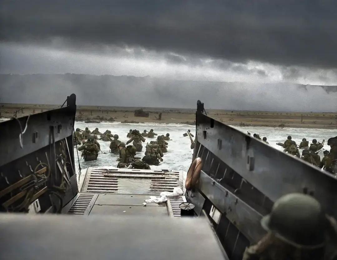 这是一张非常著名的照片,拍摄于诺曼底登陆期间,1944年6月6日,美国两栖部队登陆奥马哈海滩。士兵们背负装备、在海浪中前进,阴沉的天气和灰暗的色调更凸显出战场的残酷,很多士兵在登陆的瞬间就牺牲在密集的火力下。