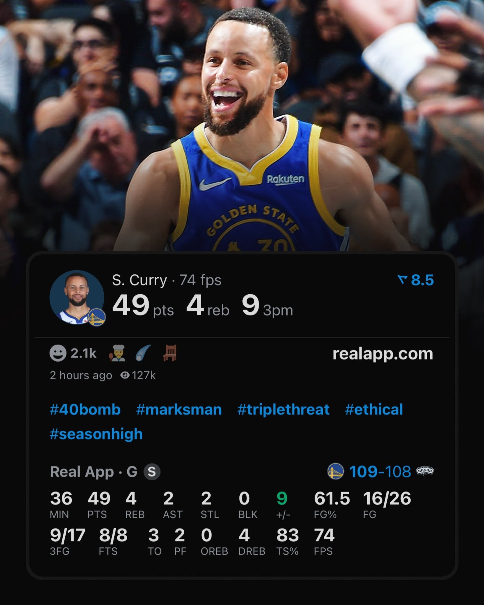 斯蒂芬库里,49分4篮板2助攻2抢断3失误,三分17中9,ts83%。37岁,连续两战马刺轰40+,一场46,一场49,30岁后40+场次来到44场,追平迈克尔·乔丹的历史纪录,35岁之后45+的场次超越詹姆斯,历史第一。同时库里也是历史最老的能连续两场至少46分的球员。赛季11场比赛,库里已经轰了3个40+...面对这样的运动员,欣赏表演就好了。ps福克斯最后4投全铁+1次失误...但凡进一个,马刺都逃出生天了,但他表示,让我们把杯赛这个组搞得更乱一点吧