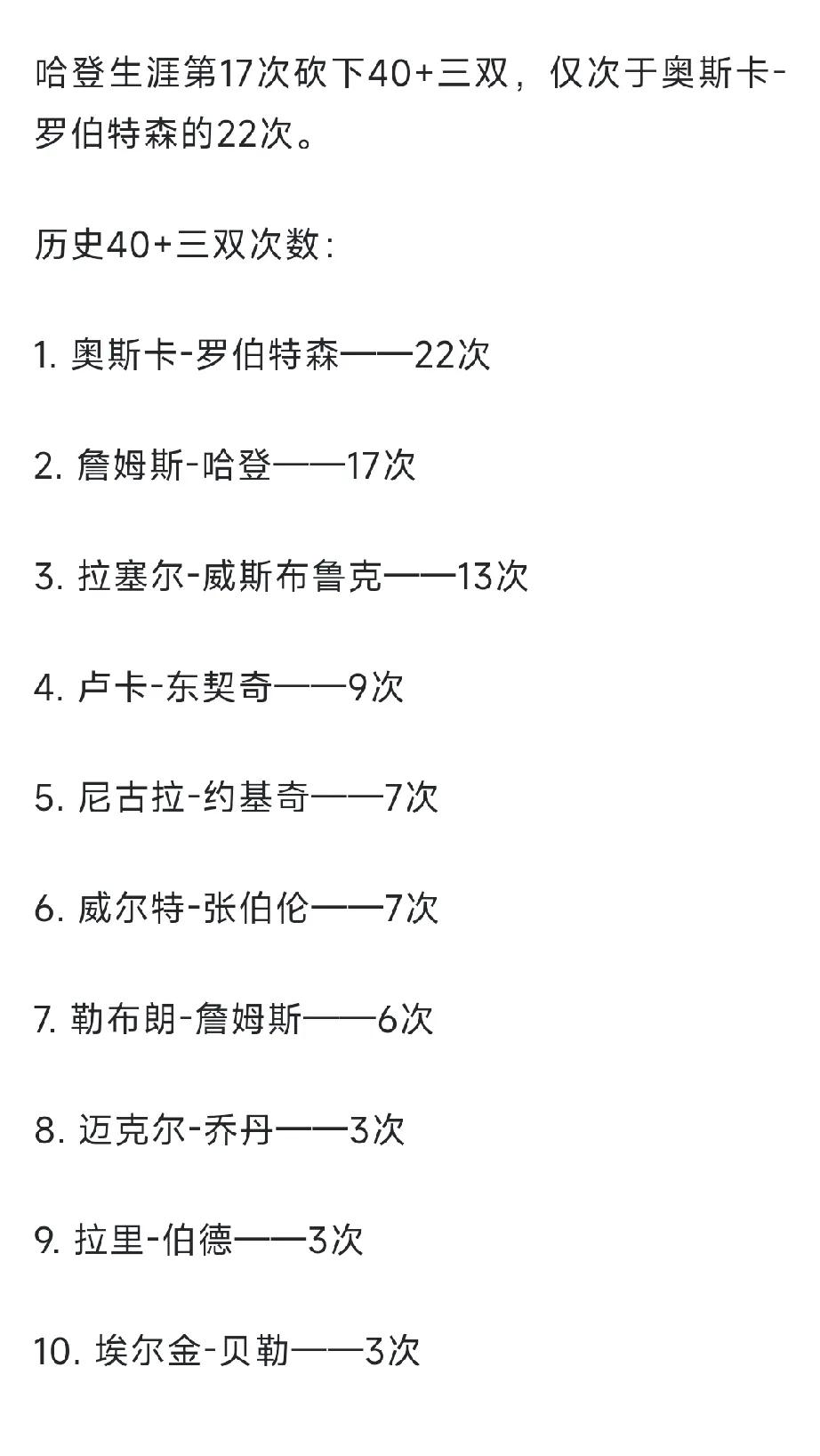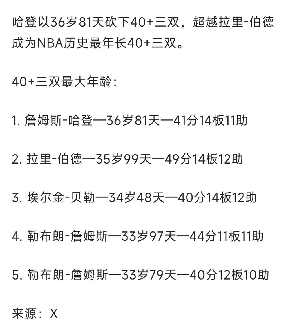 快船队史第一个40+三双,历史年龄最大的40+三双球员,生涯17次40+三双排紧追罗伯特森,出场51分3秒创下职业生涯新高,帮助快船结束尴尬的六连败,帮助泰伦卢暂时解除下课危险,帮助快船在NBA杯的小组赛中2胜0负,这一场哈登真的燃烧了自己!