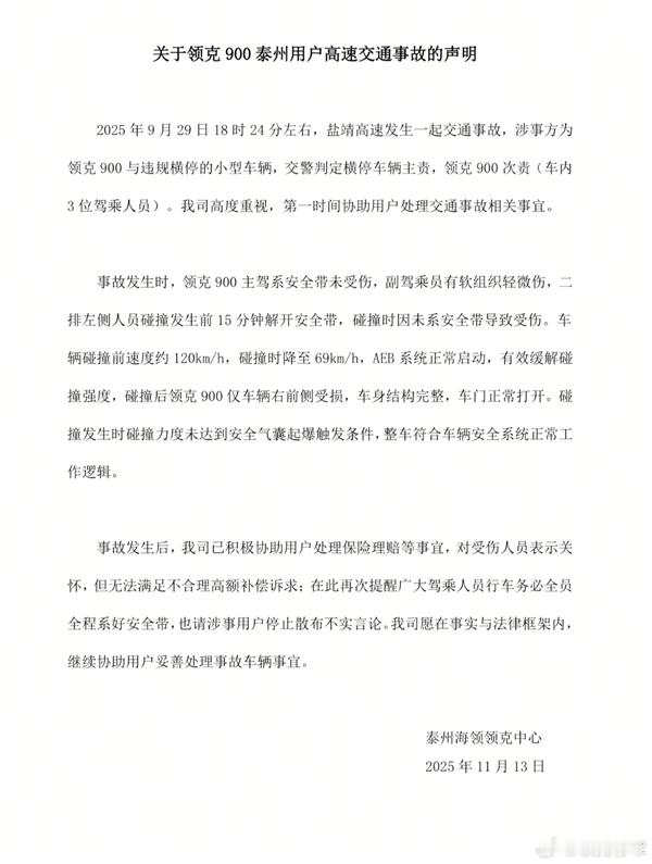 领克900车主称事故后安全带未锁死致母亲九级伤残!官方回应:该车主频繁发布不实信息,对领克品牌和产品声誉已经造成了恶劣影响
