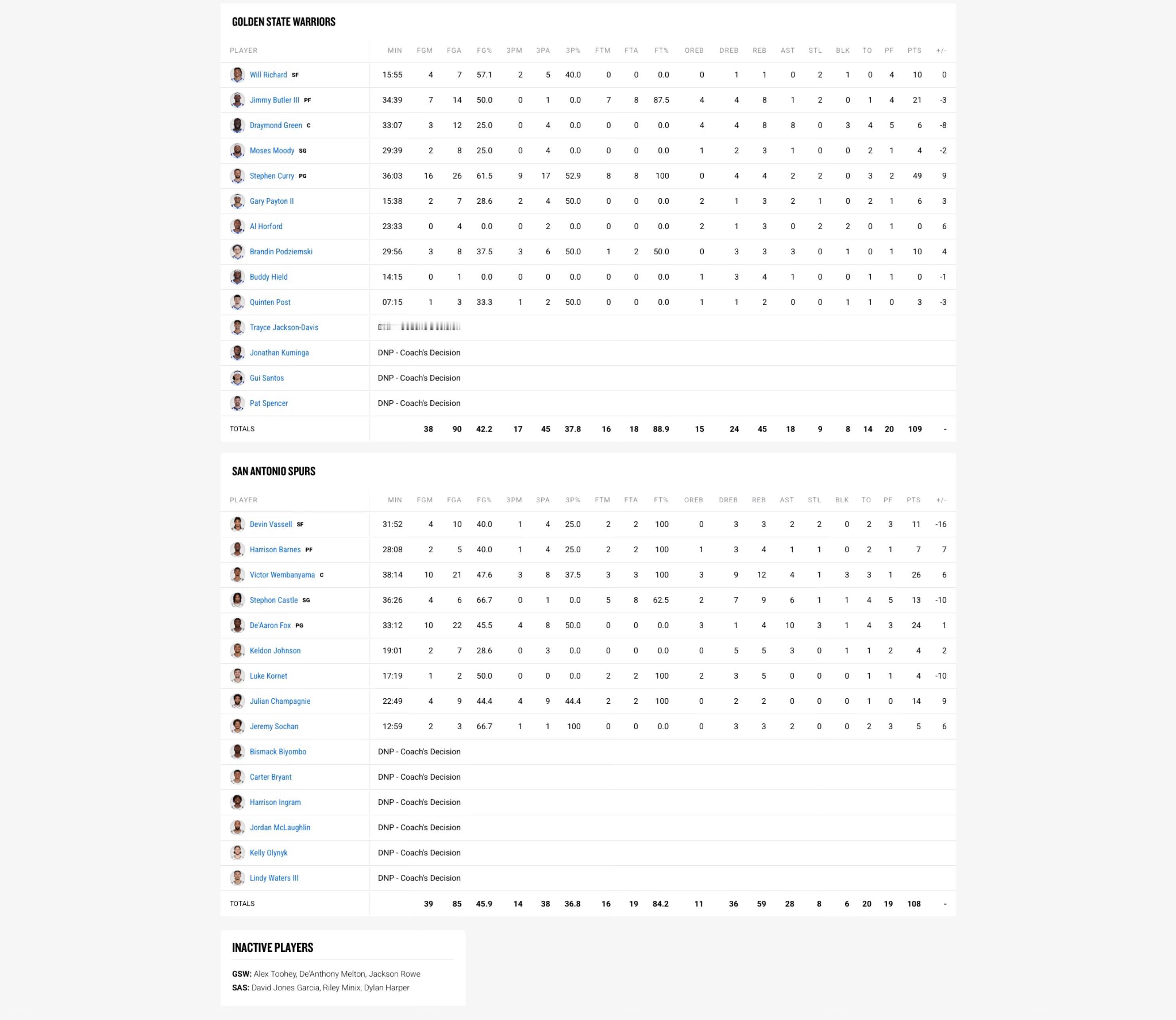 全场比赛结束!马刺108-109主场再败勇士,遭遇两连败马刺(8-4):文班亚马26分12板4助3帽、福克斯24分4板10助3断、尚帕尼14分2板、卡斯尔13分9板6助、瓦塞尔11分3板2助2断、巴恩斯7分4板1助、索汉5分3板2助、凯尔登4分5板3助、科内特4分5板勇士(8-6):库里49分4板2助2断、巴特勒21分8板1助2断、波杰姆斯基10分3板3助、理查德10分1板2断、格林6分8板8助3帽、佩顿6分3板2助、穆迪4分3板1助、波斯特3分2板、希尔德4板1助、霍福德3板2断2帽马刺下一场将在11月17日主场迎战国王 | |
