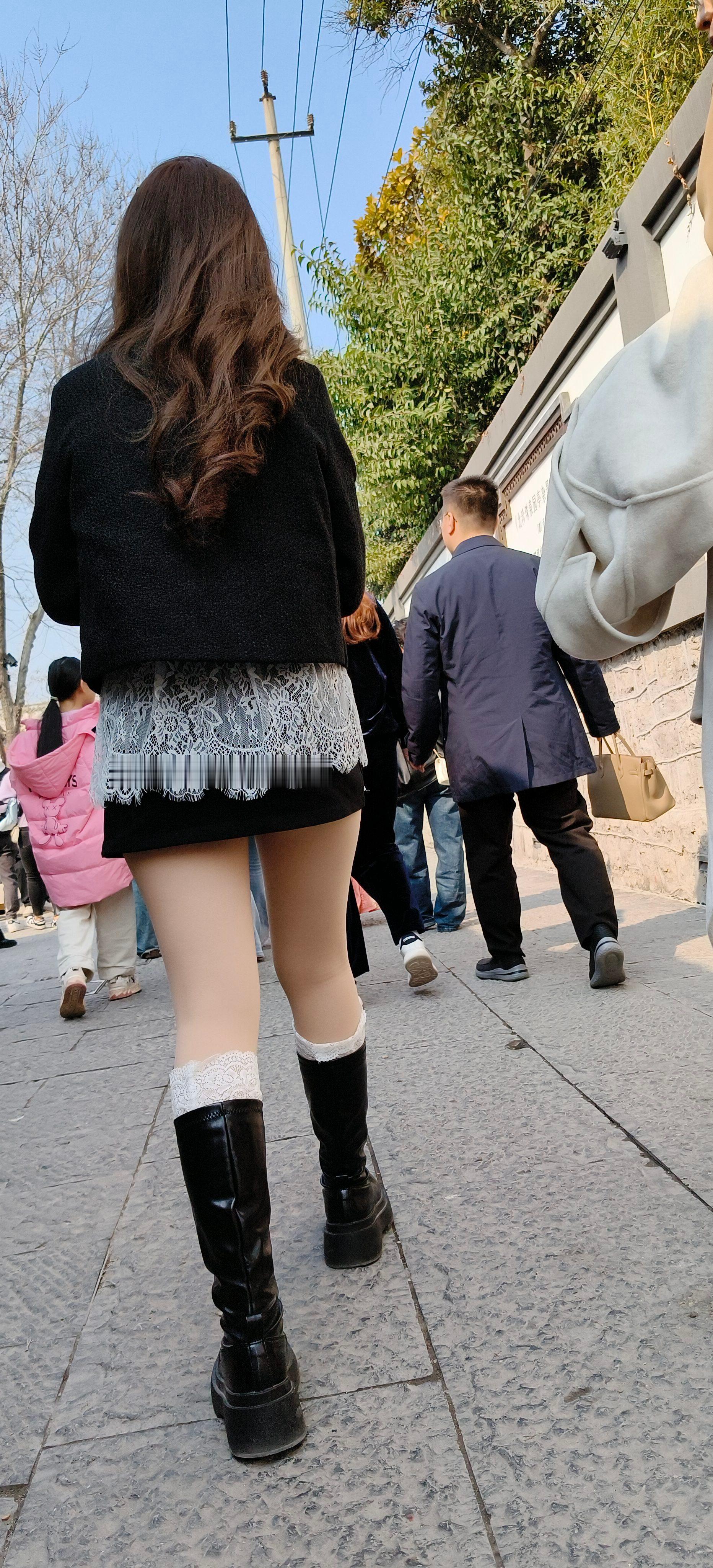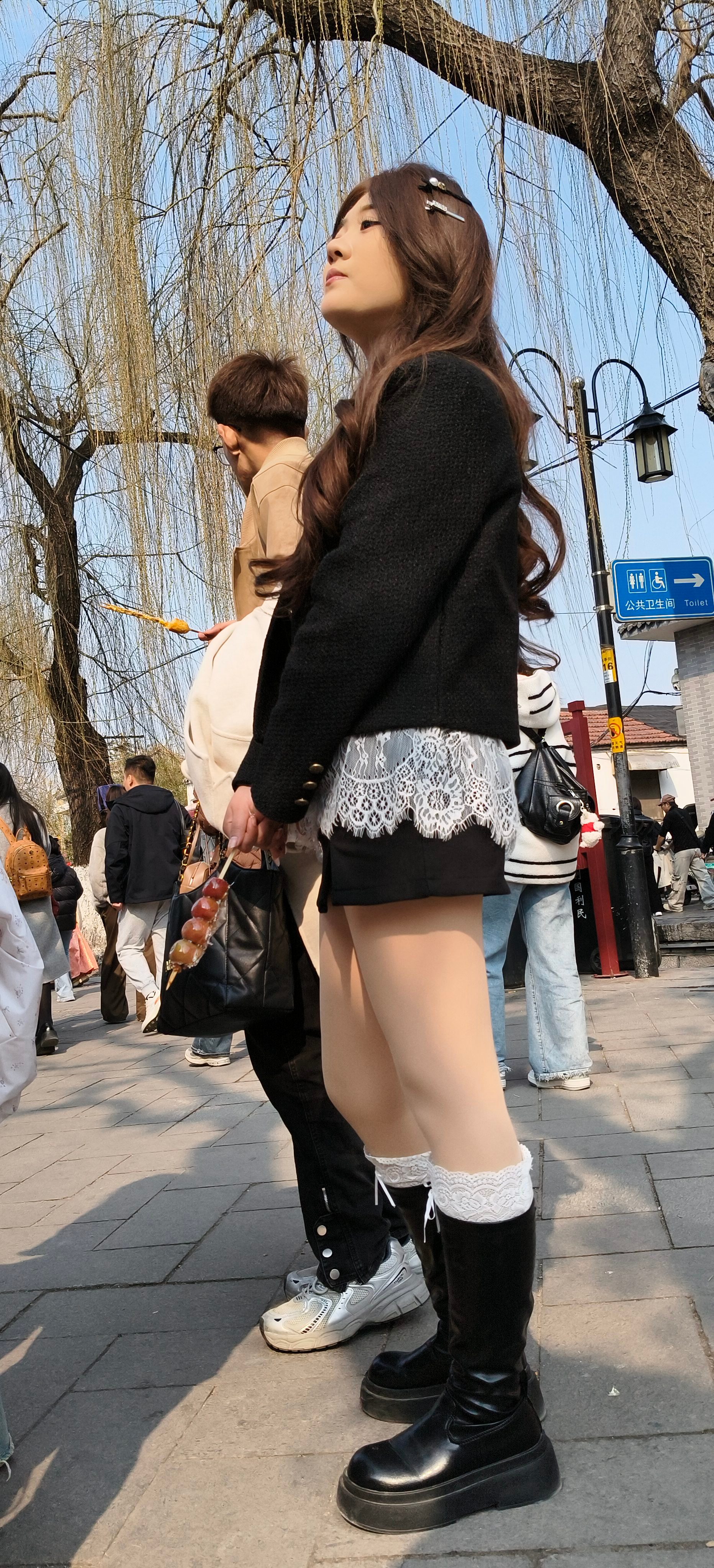 上身裹紧蓬松的黑羽绒,像揣了团软乎乎的云;下身轻摆绀色裙角,露一截细腿撞破冬日沉