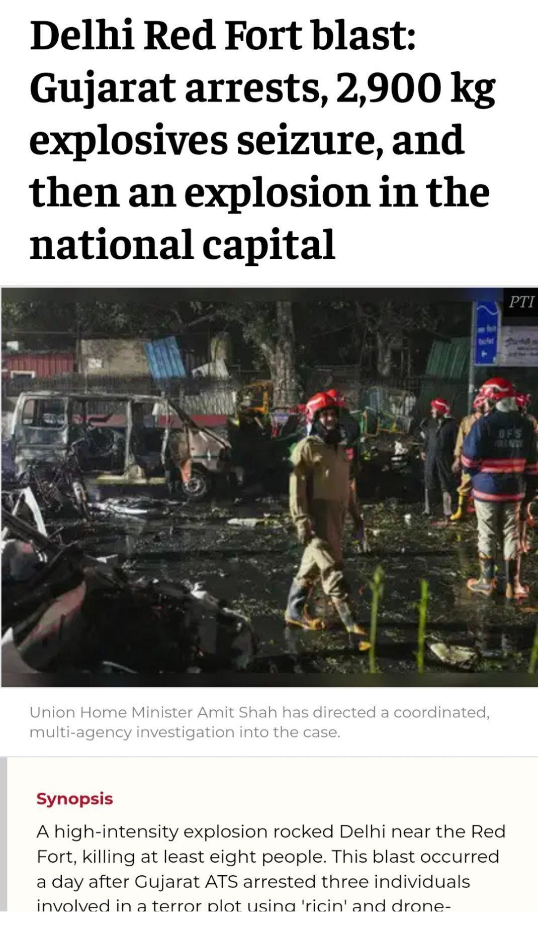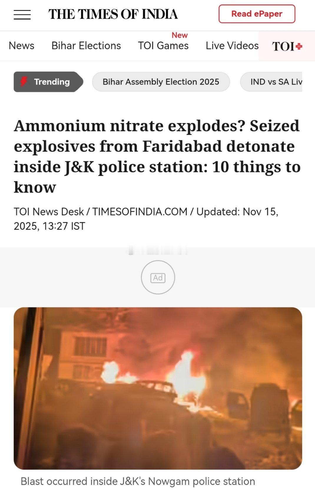 印度抽象新闻:11 月 10印度首都 新德里附近,一个白色 现代 小车在交通信号处爆炸,报道称死亡人数至少 13人。随后警方查获了爆炸相关的2,900 公斤化学品,运往警察局检查,结果检测时发生意外爆炸,警察局直接被炸毁,还造成 9 人死亡,至少 27 人受伤,其中包括 24 名警察及 3 名平民 ……也就是说,印度警方做成了恐怖分子想做而做不到的事---三天两起,还要把警察局端掉