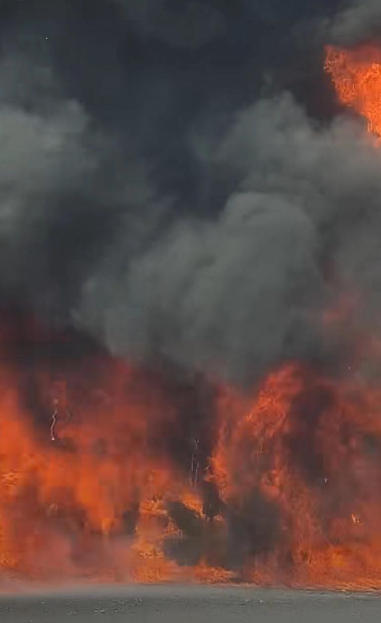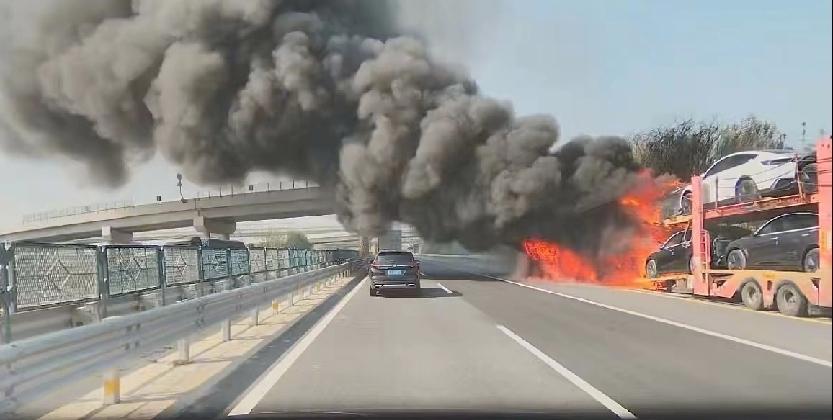 今天(11月15日)又有车辆起火,事发浙江申嘉湖高速。今天,有网友发布视频称,中午在申嘉湖高速上,一辆运输新能源汽车的拖车发生火灾。从网传视频中可见,一辆装载多辆特斯拉新车的拖车停在应急车道上,熊熊火焰不断吞噬着车辆,滚滚浓烟遮蔽了大部分高速公路车道。目前,具体事发原因尚不清楚,有待官方通报。希望人没事。热点 汽车起火燃烧事故 申嘉湖高速一运输新车的拖车发生火灾