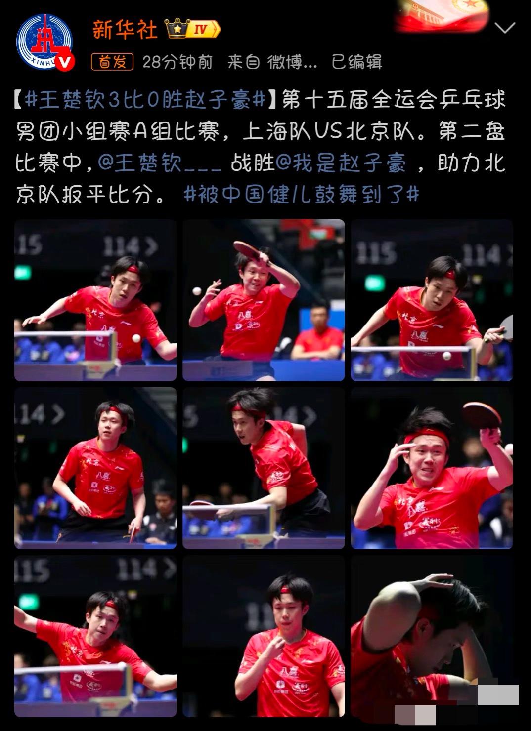 全运会乒乓球团体11月15日上海队2:3北京队 王楚钦笑了 第一盘许昕/周恺3:2马龙/黄友政 5:11,11:6,7:11,11:7,11:5 第二盘赵子豪0:3王楚钦 8:11,7:11,11:13 第三盘周恺1:3马龙 11:8,5:11,8:11,8:11 第四盘 赵子豪3:0黄友政 11:6,11:7,11:6 第五盘 许昕0:3王楚钦 6:11,4:11,2:11 王楚钦终于笑啦, 半决赛失利, 为团体贡献二分, 王楚钦依然最可爱, 最优秀!