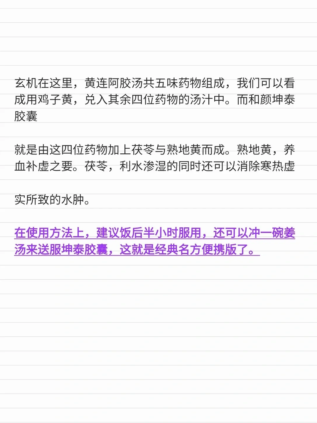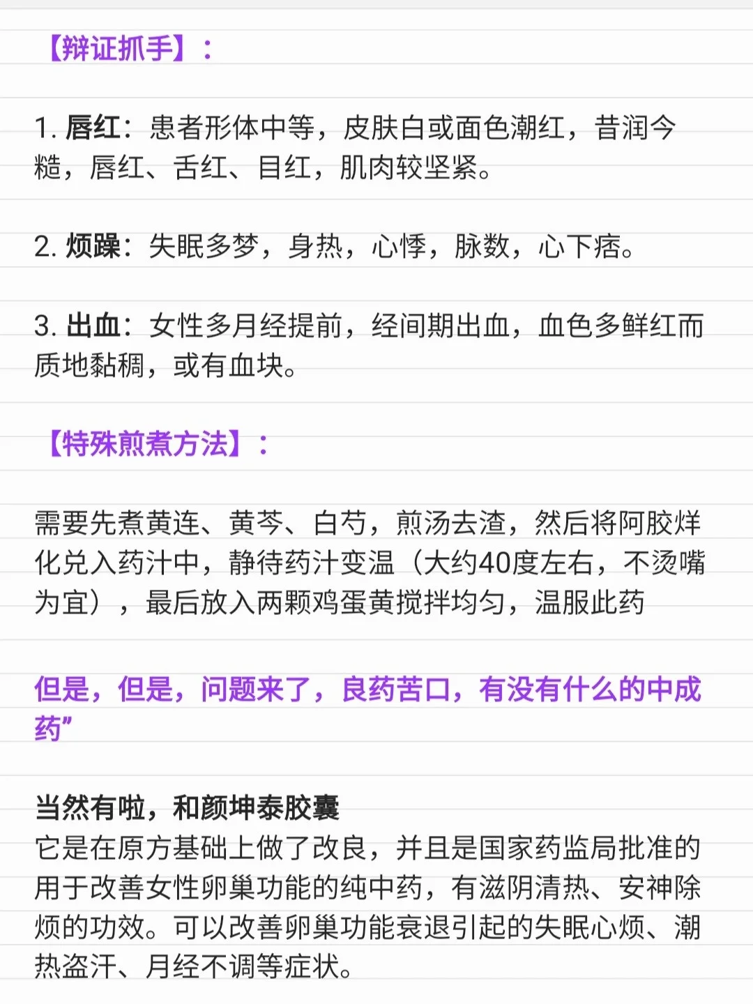 临床中更多使用和颜坤泰胶囊,它就是在此经典名方上做了化裁。去鸡子黄,重用熟地黄、加茯苓,减少黄连用量。