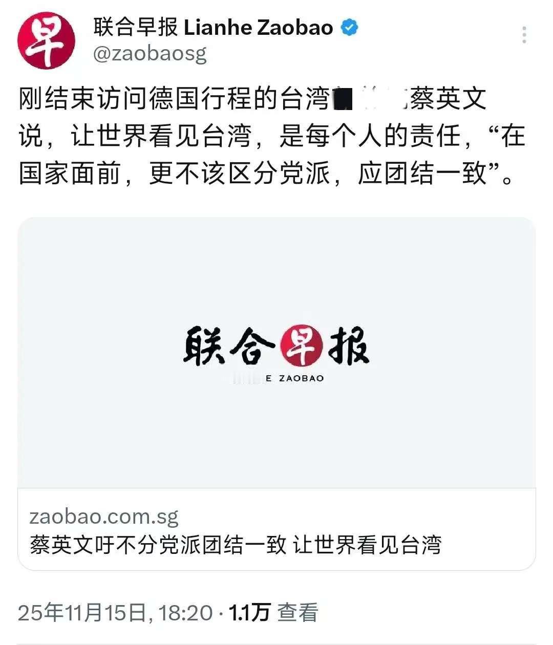 昨晚,新加坡《联合早报》报道:“刚结束访问德国行程的蔡英文说,让世界看见台湾,是