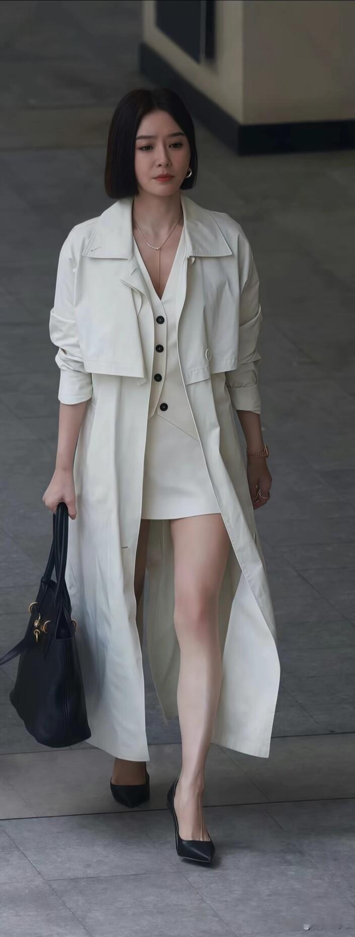这套白色叠穿太戳审美!长款风衣+短款西装裙,利落短发配黑包高跟鞋,气场与优雅都拿捏,通勤出街都好飒~