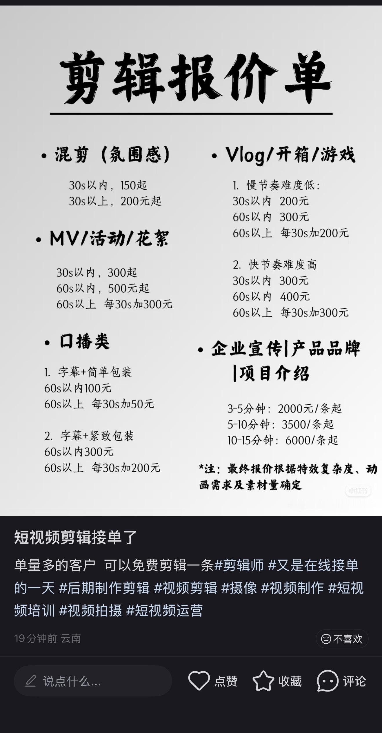 这是小红书视频剪辑的报价单如何?贵不贵?