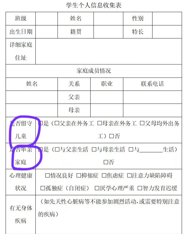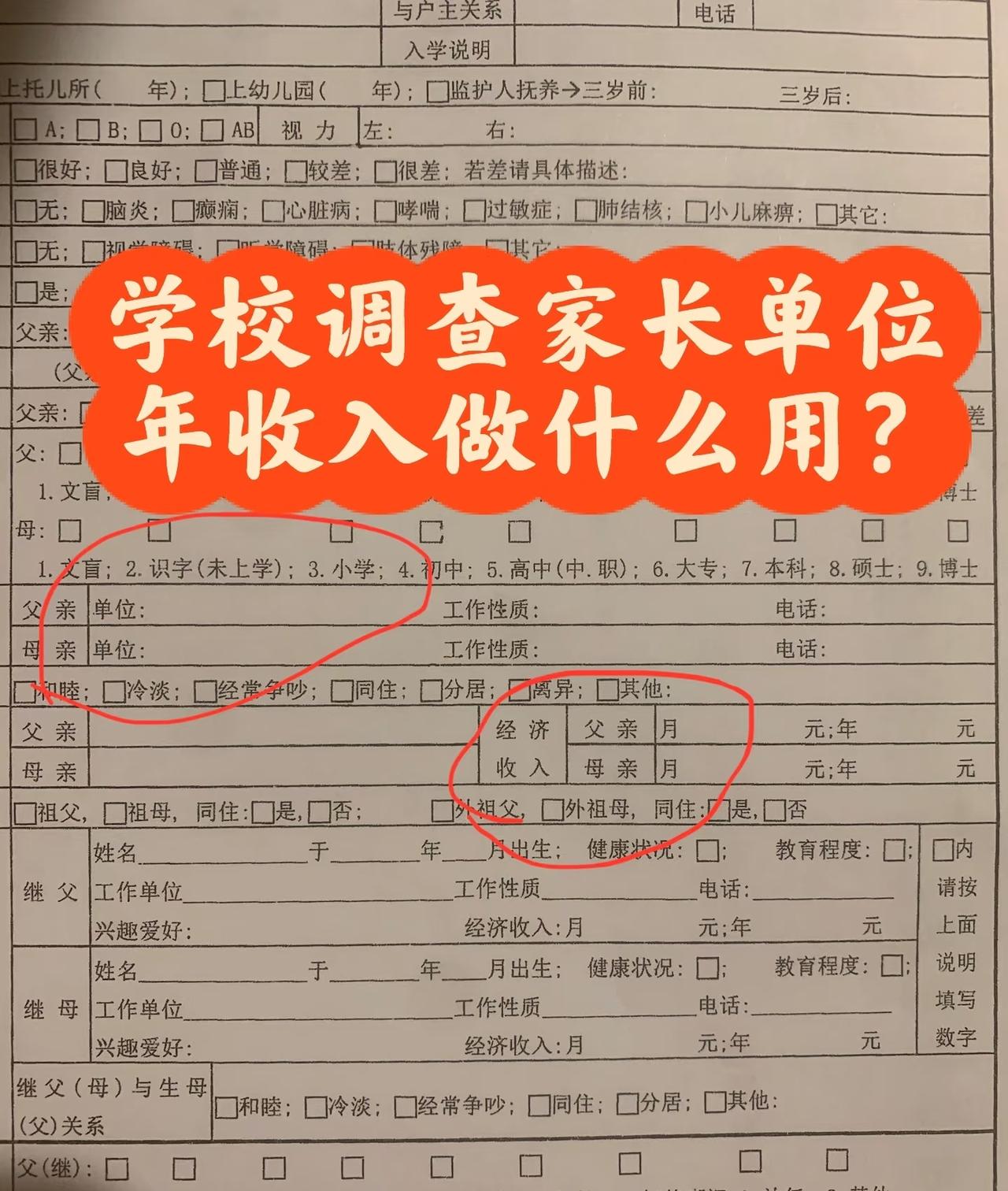 学生上学,为什么要调查家长职务❓️ 难道上学还得搭配家长资源? 难道不是为某些人看碟下菜做好摸底! 这种登记表大家都经历过吧! 从我们自己读书 到现在我们的孩子 新生入学都要填写资料 而且越来越详细! 是否单亲,甚至月收入多少 有多少家长会如实填写[捂脸] 填多了高调,填少了怕孩子被看不起 教育这件事 不需要了解这么多学生家庭隐私吧!