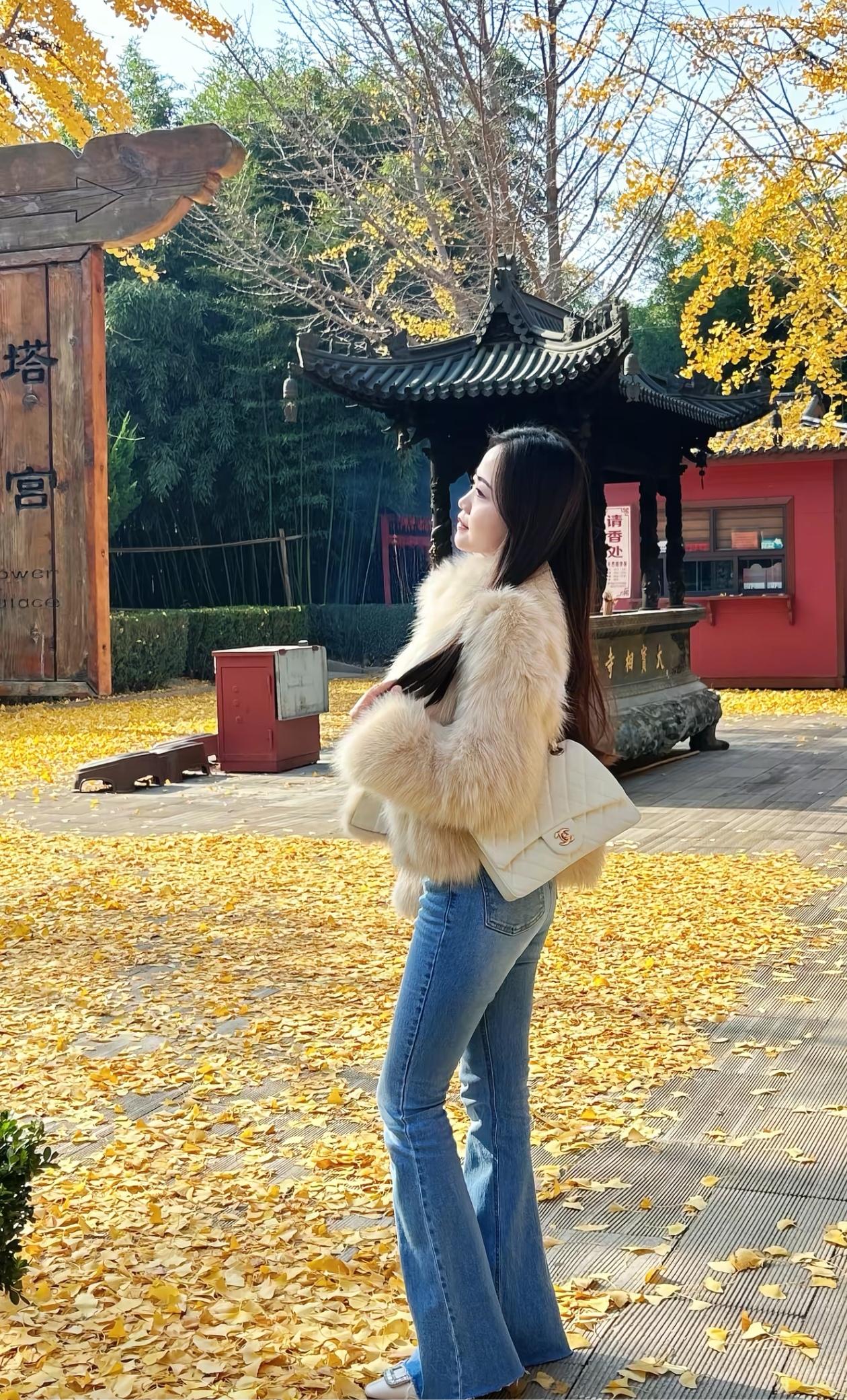 冬日暖阳下,优雅女子在古风庭院中漫步,毛绒大衣与红唇相得益彰,尽显温婉与时尚。